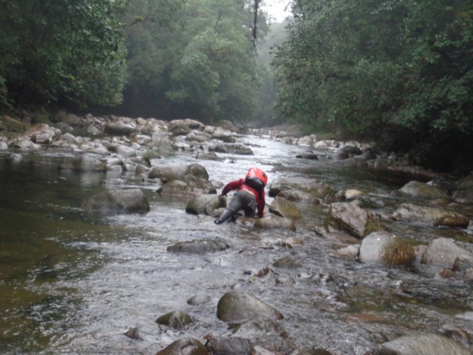 Estando de voltas ao rio, que fez um grande cotovelo, seguimos nos enfiando nas gargantas e escalando paredes pelo resto do dia, até que lá pelas três da tarde finalmente o rio nos deu uma trégua e nivelou um pouco, onde grandes lagos e poços tinham que ser cruzados a nado, e sem as paredes para eu escalar e sem querer ficar quebrando mato no peito, eu não tinha outra coisa a fazer se não saltar das pedras e nadar, nadar e nadar. Às quatro da tarde nos chama a atenção um afluente do lado direito do rio. Não era um rio muito grande, mas o suficiente para descobrirmos que se tratava do rio que foi usado pelo Renato Trench na única expedição que se tem notícia. Foi justamente através daquele riacho de montanha que o cara acessou o meio do vale e mesmo sem ele ter feito toda a travessia do Vale do Itariru, vindo do leste por uma trilha conhecida, esse foi também um grande feito, digno do nosso respeito. E para homenagear esse grande explorador do passado, resolvi chamar esse rio de AFLUENTE TRENCH, uma homenagem mais do que merecida. Logo à frente mais dificuldade nos atravessa pelo caminho e como a temperatura havia baixado muito, resolvi tentar me manter o máximo possível fora da água e enquanto o Ligado e o Luciano continuavam a se jogar nos poços gelados, eu me metia a escalar grandes paredes, andando pelas suas laterais e foi numa delas que me encontrei com um acidente que poderia ter me custado muito caro.
