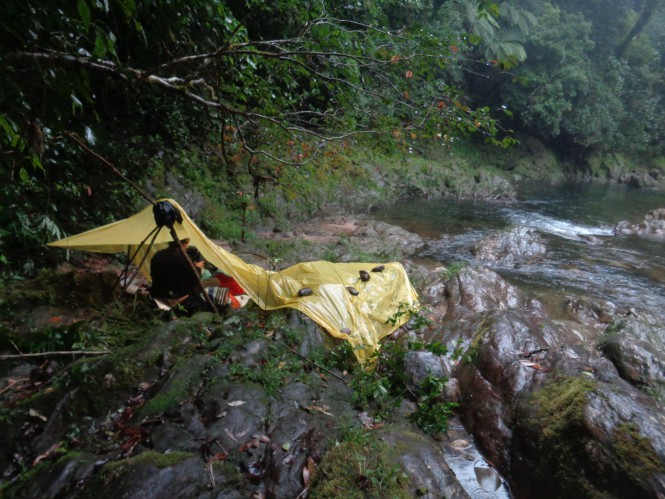 Tudo parecia perfeito, mas a chuva veio e veio com gosto. A água começou a escorrer por baixo das folhas de palmeira e meu saco de dormir, que já não estava seco, empapou de vez. Fiquei ali naquele abrigo tosco olhando para escuridão da noite e pensando no isolamento em que nos encontrávamos. Naquele momento, muito provavelmente, não haveria ninguém mais isolado que nós em todo o Estado. Estávamos encravados no centro selvagem de um vale perdido a sei lá quantos dias da saída, sem sinal de telefone ou qualquer outra comunicação. Estávamos em um mundo perdido, um mundo em que nem mesmo nós sabíamos nossa localização exata e se ao mesmo tempo isso era desolador, também não deixava de ser encantador, um sentimento de que estávamos testemunhando o que poucos ou quase ninguém ainda havia testemunhado, uma natureza selvagem como sempre foi e nós éramos parte disso agora.