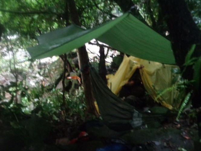 Não havia chovido durante o dia, mas o final de tarde, já quase noite, já começava molhado. O Rodrigo montou sua rede numa árvore à beira do rio e quando o Luciano lançou a ideia de fazermos um abrigo em um pequeno espaço de areia, não pensei duas vezes, já deslumbrando a possibilidade de termos uma noite mais quente e mais confortável, já que meu saco de dormir estava muito úmido, quase beirando ao molhado. Cortamos umas folhas de palmeira e forramos o chão, perfazendo uma cama fofinha. Com três troncos o Luciano fez uma cabana e cobriu com uma lona plástica, meio que parecendo com uma tenda de índio americano. Ficou um lugar muito aconchegante, bem propício a segurar o calor do corpo e nos aquecer durante a noite. Enquanto ele fazia os últimos ajustes fui cuidar do jantar e já que o Ligado havia se recolhido faz tempo, resolvi cozinhar para nós três. Arroz, carne seca, azeitonas verdes, queijo ralado e suco de laranja, foi o cardápio.