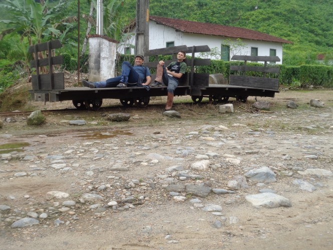 Pela estrada longa e que nunca chega ao fim, alcançamos o Rio Preto, mais um rio totalmente limpo e como o nome mesmo diz, de águas negras, onde cruzamos por cima de sua ponte e meia hora depois chegamos a um amontoado de casas onde, pasmem, havia uma linha férrea . Pois é, uma linha de trem no meio do sertão da Serra do Mar, construída para escoar a produção de banana e palmitos. Não chegamos ver a locomotiva que puxa os “vagões” de madeira e até pensamos que estaria desativada, mas depois ficamos sabendo que ainda é uma linha utilizada, o que não deixa de ser um espanto, muito porque, não consegui saber nada sobre essa linha férrea, nem mesmo na internet.