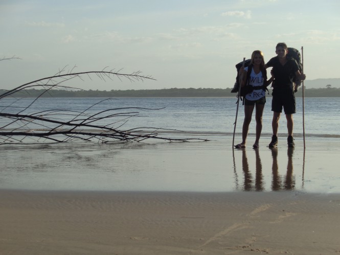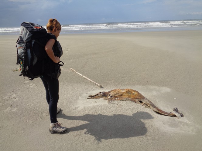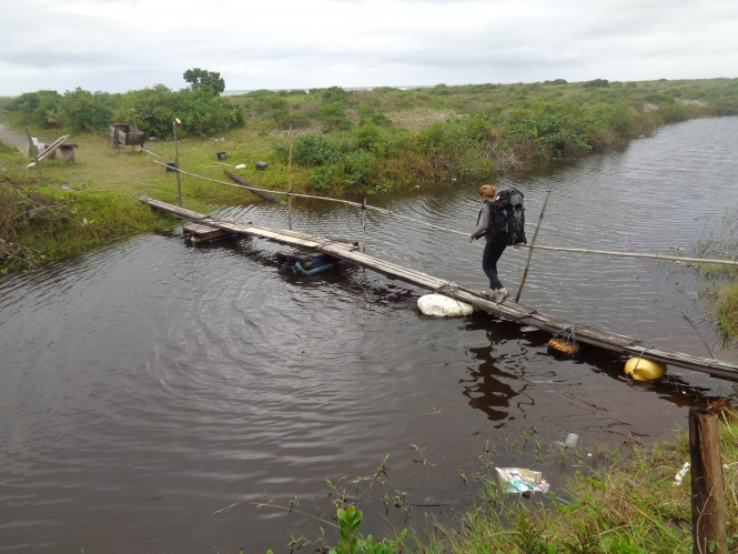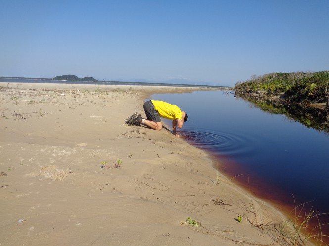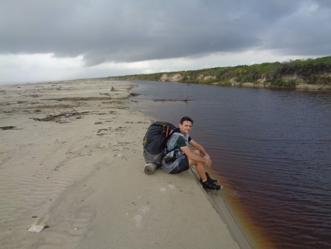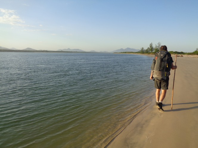 A chuva havia parado, mas as nuvens negras não deixavam dúvidas: o céu iria desabar nas nossas cabeças. Improvisamos uma capa de chuva e seguimos a passos firmes para aproveitar a manhã fresca. Menos de quarenta minutos avistamos o que nos parecia ser uma casa enfiada no meio da restinga, de onde uma meia dúzia de cachorros barulhentos saiu para nos acuar na praia, mas passamos batidos sem dar muita liga. Mais uma hora de caminhada chegamos a foz de um rio com águas cor de coca cola e foi aí que a chuva que prometia cair, caiu. Como não era uma chuva provida de raios resolvemos nos esconder embaixo de um pequeno arbusto solitário no meio da restinga, mas logo nos vimos molhados, então abandonamos a ideia e nos lançamos a dançar na chuva já que o calor não havia nos abandonado. Caminhamos às margens do rio que foi aumentando de largura, onde pequenas dunas, que se formaram na praia, tiveram que ser cruzadas. Vamos mirando no horizonte e tentando identificar à frente o que parece ser várias pessoas vindas em nossa direção. Pensamos ser um grupo de pescadores, mas não demora muito, descobrimos ser um grupo de ciclistas fazendo o caminho inverso ao nosso e durante toda nossa travessia só encontramos mais um grupo de ciclistas e ninguém, absolutamente ninguém se aventurando a pé e isso me faz crer que esse é mesmo um roteiro especial, uma travessia esquecida, um roteiro que ainda não foi descoberto pela maioria caminhante do país.
