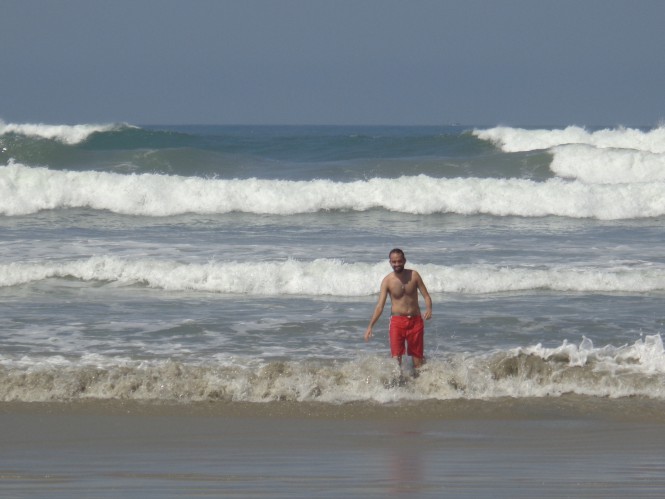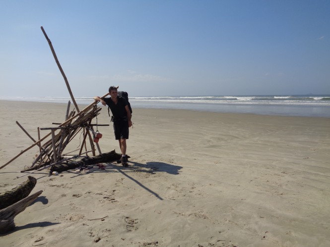 Aproveitando a parada para uma boa conversa com a família de pescadores, resolvemos nos enfiar de vez na água e inaugurar nossos mergulhos no mar. Como eu disse, a água estava espetacularmente quente, com uma transparência incrível já que as águas dessa região costumam ser um pouco mais escuras por causas dos rios que vem dos mangues. O mar é um pouco violento, com ondas altas e é preciso ficar atento às corretes, mas mesmo assim foi um grande prazer nos jogar naquele marzão sem fim, onde apenas nós três reinávamos soberanos naquelas praias, já que até a família de pescadores já haviam tomado seu rumo e se perdido no meio da restinga, de volta para o mundo de sonho deles. Já é mais do que sabido que eu odeio praias lotadas e estar ali naquele lugar me traz uma satisfação indescritível, mas nós não viemos para pregar a bunda na areia da praia não, temos dezenas de km pela frente e não podemos nos demorar por ali, então botamos novamente a mochila às costas e partimos para mais uma pernada. Mas o sol estava mesmo queimando tudo e não deu nem mais uma hora de caminhada e novamente pinchamos as mochilas na areia e corremos para o mar, quando digo corremos, me refiro a mim e a Julia, porque o Heitor aproveitou um barranco de uma duna para se esconder na sombra e tirar uma soneca. Quando voltamos do mar, ele acordou e foi se banhar e esse seria o último mergulho dele em nossa companhia, porque logo quando voltou também apanhou sua mochila, se despediu da gente e foi se perder de volta na imensidão da praia, tomou o caminho de volta para Marujá e até então, essa foi a última vez que ouvimos falar nele, do mesmo jeito que apareceu no nosso caminho, desapareceu para sempre.