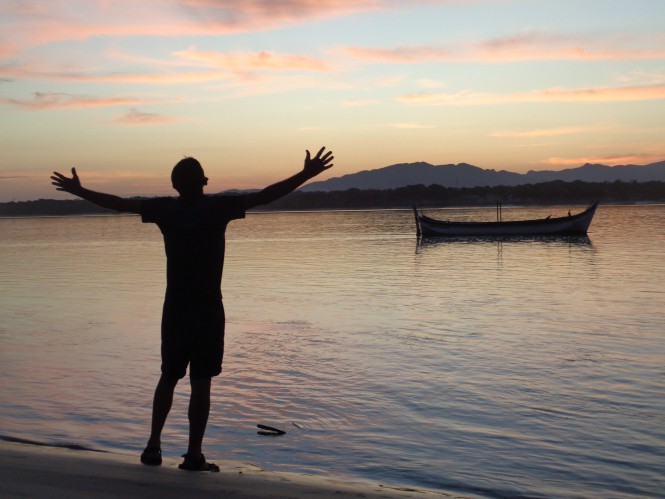 Despedimos-nos do pescador e continuamos caminhando pelas praias internas e como o calor ainda estava de matar, aproveitávamos para vários mergulhos nas águas mornas. Fomos mirando as casinhas e os barcos que se esparramavam à beira do canal e como eu não sabia se teríamos onde ficar no povoado, já fui vendo algum lugar que pudéssemos montar nossa barraquinha e realmente, se quiséssemos, poderíamos acampar por ali mesmo, mas achei melhor tentar um camping no vilarejo. Minutos depois já estamos estacionados no porto da vila, onde uma meia dúzia de barquinhos está amarrados, porque nem trapiche existe. Um homem sentado à beira da praia nos indica o caminho para o centro do povoado. Entramos então a direita, passamos por uma pontinha, pela igrejinha e chegamos em um camping. Na verdade, uma área sombreada e sem nenhuma barraca se quer. A família simples do lugar nos acolheu de braços abertos, mas já nos avisou que a vila anda meio sem água e banho somente de canequinha. Montamos nossa barraquinha e voltamos para o canal para aproveitarmos o final de tarde e não foi um final de tarde qualquer. Eu e a Julia sentamos na areia da prainha e nos preparamos para o deslumbramento. O sol começou a se por, refletindo nas águas do canal, avermelhando tudo ao seu redor. Os barquinhos coloridos, espalhados pela água, quase não se mexiam e nós quase nem respirávamos, com medo de perder aquela cena que teima em não sair da nossa retina e quando a gente resolveu se levantar para ir embora, fomos obrigados a bater continência para uma lua cheia avermelhada que espalhou brilho por todos os cantos e a gente voltou para o povoado para tomar banho de canequinha, feliz da vida por sermos testemunhas daquele momento único.