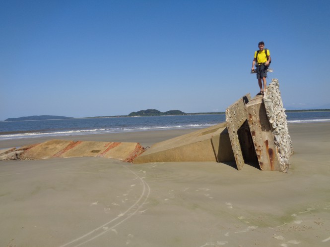 Não tenho dúvidas, esse é um lugar deslumbrante. Ao nosso lado, bem pertinho, a Ilha do Mel nos atrai a atenção, onde dá até para ver o seu farol. Mas falando em farol, o farol da Ilha das Peças finalmente apareceu e antes de nos apresentarmos a ele, nos entretemos com um cadáver de uma tartaruga jogado na areia e logo depois, mais outra tartaruga, mas desta vez dentro da água e quando o farol se aproximou, corremos para vê-lo, feito D. Quixote, querendo derrotar os moinhos de vento. O gigante deitou, não sei em que época, mas hoje jaz esticado em escombros na areia da praia, atravessado quase de uma ponta à outra e mesmo não sendo nós os responsáveis pela sua desgraça, não nos furtamos em trepar em sua estrutura e tripudiar encima de seu esqueleto de concreto.