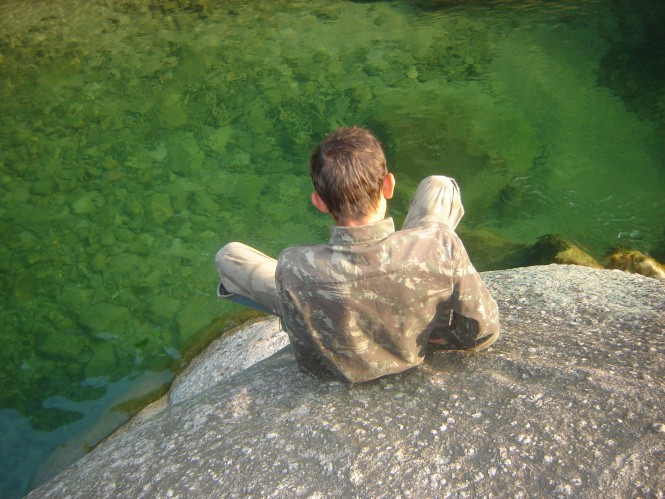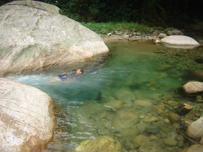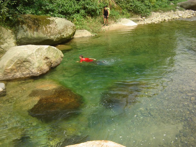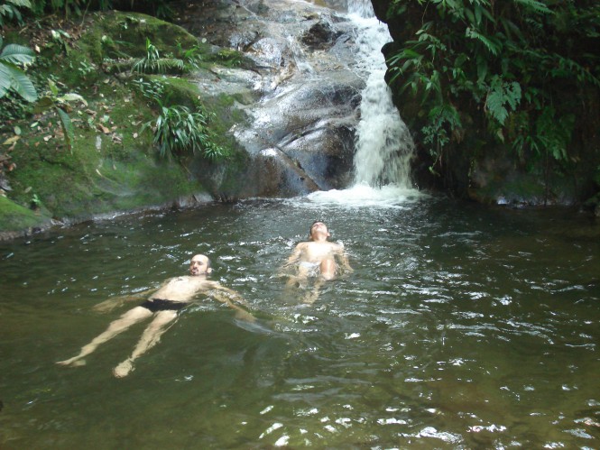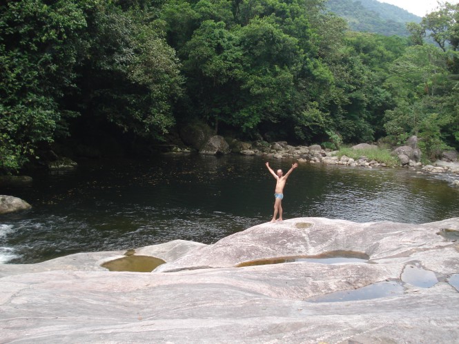 No domingo de páscoa, acordamos preguiçosamente, sem muito compromisso com nada, apenas curtindo o bom e velho ócio, que é a arte de fazer coisa alguma. Vagarosamente, desmontamos as barracas, tomamos café, demos mais uns pulos no paraíso de águas verdes e partimos. Subimos por uns 10 minutos, onde passamos pelo poço do sonrizal, que chamei por esse nome porque uma pequena queda fazia sair de dentro do poço milhares de bolhas, como se ele estivesse em ebulição. Outros 20 minutos foram gastos para alcançarmos a Prainha do Rio Mogi. Os três rapazes ainda estavam lá e já se preparavam para ir embora. Essa prainha é muito famosa na região de Paranapiacaba, porque é possível alcançá-la por uma trilha de não mais de 3 horas de descida, mas como tudo que desce um dia tem que ser subido ela acaba sendo uma trilha para ser realizada em um dia inteiro e intenso, dessa maneira não é muita gente que se aventura por aqui, ainda mais agora que a trilha esta fechada e vigiada pela fiscalização. Tanto que em dois dias de travessia pelo Vale do Mogi, só encontramos apenas dois pequenos grupos. O poço da prainha também tem uma coloração esverdeada, onde existe uma pedra que serve de trampolim natural. Passamos mais ou menos uma hora nos refrescando e então demos às costas para o Rio Mogi e partimos para a derradeira subida.