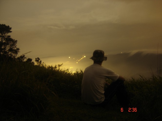 De cima do mirante é possível avistar as luzes de Cubatão e suas fábricas e usinas. Já passava da três da madrugada e enquanto a galera ficou tomando vinho com os soldados, eu que não sou dado ao álcool, fiquei batendo papo com o Ronaldo, que acendeu uma tocha feita de bambu e óleo diesel. Ele me contou uma história ou lenda sobre o cara que acionava o gerador que havia ali no topo para iluminar uma antena sinalizadora para aviões. Disse que naquela noite o funcionário que ficava la encima foi morto por uma onça e não pode ligar o gerador e por causa disso um avião de pequeno porte se chocou contra a montanha. Acho que foi o único caso em que uma onça derrubou um avião. Bom, papo vai papo vem, mas já estava ficando tarde. O Tio do Indiana ia descer a trilha a noite,os soldadinhos foram até o pico só para tomar cachaça e fumar um cigarrinho do capeta e já se preparavam para voltar à Paranapiacaba e nós iríamos acampar por ali mesmo. Como a noite estava espetacular resolvemos somente bivacar, sem montar barraca alguma. Estendemos nossos sacos de dormir no concreto que servia de base para as antigas antenas e caímos no sono, mas não demorou muito uma nuvem safada resolveu pingar encima de nós. Então pegamos nossas coisas e fomos dormir embaixo de uma laje destruída, que abrigava os antigos geradores, que por sinal ainda protege as carcaças do dito cujo. O lugar é escuro, sombrio, parece uma toca de ratos, mas estava seco e abrigado do vento e foi lá que passamos a noite, embaixo de uma laje de dois palmos de altura.