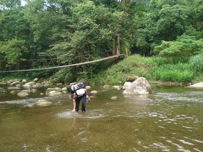 Pegamos nossas coisas e voltamos para a caminhada. Atravessamos o poço, beirando o lado esquerdo e então saímos já na rua de terra, onde várias viaturas e uma ambulância estavam estacionadas. Uns soldados da polícia militar nos fitavam com cara de poucos amigos, até que um deles, o mais mal encarado de todos me intimou a dar esclarecimentos. “Porra” logo eu! Queria saber de onde víamos, para onde íamos. Hesitei por um momento. Falo a verdade ou conto uma lorota? Não consegui mentir, estava hirto de tanto medo. O policial me olhou com cara de reprovação, mas queria saber se não tínhamos visto o tal sujeito perdido na trilha. Depois dos devidos esclarecimentos, eu queria era sair dali o mais rápido possível e então voltamos a caminhar naquela estradinha tão estreita como uma trilha. Poucos minutos à frente damos de cara de novo com o Rio Quilombo e sua gigantesca ponte pêncil, onde também é possível passar de carro por dentro do rio, já que uma grande laje de concreto foi construída por lá. Foi neste local que reencontramos nosso amigo Ronaldo, que mantém escondido no meio do mato, em algum lugar secreto, uma área de acampamento onde ele vai desfrutar das belezas deste lugar com sua família e seus amigos. Fiquei curioso para conhecer a família do tio do Indiana, um cara de uma gentileza do tamanho do mundo. Encontrar com estas figuras na trilha faz qualquer viagem valer a pena.