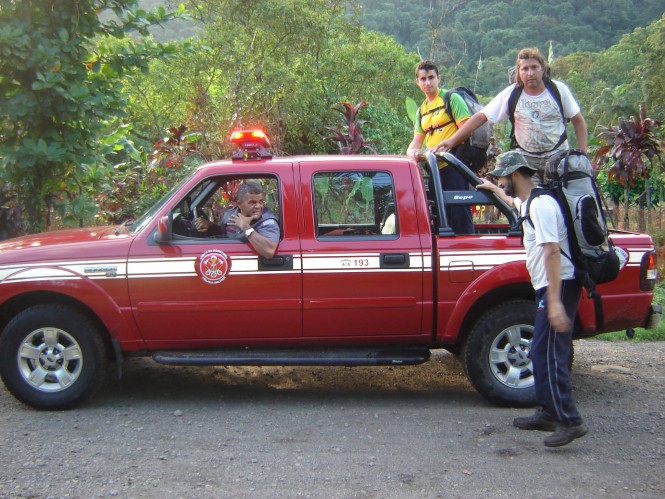 Ficamos lá por um bom tempo batendo papo com o Ronaldo, quando chegou o pessoal da REDE GLOBO LITORAL. Conversaram com a gente, perguntaram se sabíamos de alguma coisa, se estávamos a par do acontecido. Foi então que de repente a linda repórter e o feio cinegrafista, perguntaram se a gente não poderia conceder uma entrevista para eles. Até agora não sei quem foi o filho da puta que disse que eu era o cara que deveria falar (rsrsrsrsr).Fui respondendo as coisas que a repórter ia me perguntando, que por incrível que pareça não tinha nada a ver com o caso do sujeito perdido na trilha. Ela queria saber como era aquele negócio de um monte de homens largarem a civilização e sair a caminhar no mato, se a gente fazia isso há muito tempo, se não era perigoso e essa balela toda que a imprensa burra e desinformada gosta de explorar. Demos adeus aos nossos minutos de fama, nos despedimos do nosso amigo Ronaldo e partimos novamente para caminhada, que já sabíamos que seria muito longa, até chegarmos à Piaçaguera-Guarujá, coisa de mais de 10 km, mas a sorte bateu a nossa porta novamente. Uma caminhonete do Corpo de Bombeiros, que estava voltando do local do resgate, parou e nos ofereceu uma carona. Pulamos para cima do veículo e passamos mais de 10 km rindo dos acontecimentos.