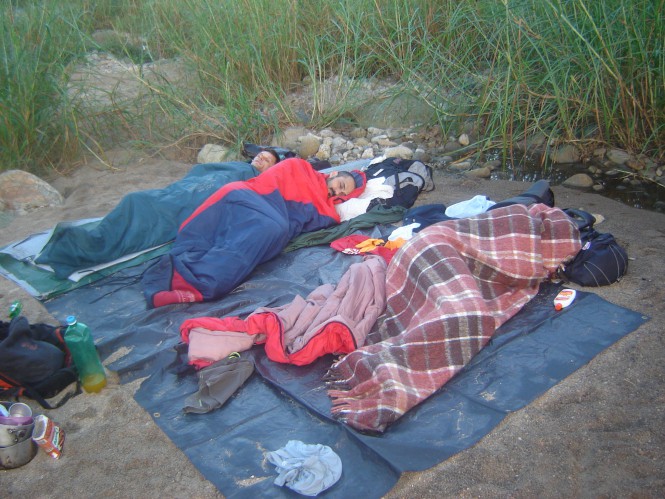 Finalmente estávamos no famoso Rio Mogi. Já passava das cinco da tarde e a noite não tardava em cair. Despedimos-nos do seu Severino e começamos a subir o rio, que tinha águas limpas, mas não cristalinas por causa de um tributário próximo que trazia um pouco de sedimentos. Esta parte do rio é extremamente rasa, mas não há trilhas em sua margem, é preciso ir cruzando de uma margem a outra e escolhendo o melhor caminho para seguir. O dia já se foi e a nossa preocupação era arrumar um local para acampar. Foi quando chegamos a uma praia de areias claras e eu e o Dema batemos o olho e decidimos que o melhor local era ali mesmo. O tempo estava muito bom e não parecia que iria chover e então decidimos por não montarmos as barracas, iríamos bivacar mais uma vez. Acendemos o lampião de velas e enquanto alguns tomavam um banho outros cuidavam do jantar. Na areia da praia espalhamos um grande plástico e esticamos nossos sacos de dormir e isolantes. A lua chegou, mas não era uma lua qualquer, era uma lua cheia, esplendorosa, transformou a noite em dia e isso nos fez ficar conversando sobre a vida até altas horas da noite. Eu e o Dema confessamos a nossa apreensão. Tudo havia dado tão certo até agora que não descartávamos a hipótese de algo muito ruim nos acontecer daqui para frente. Era muita sorte para uma caminhada só, tudo estava parecendo um roteiro de filme.