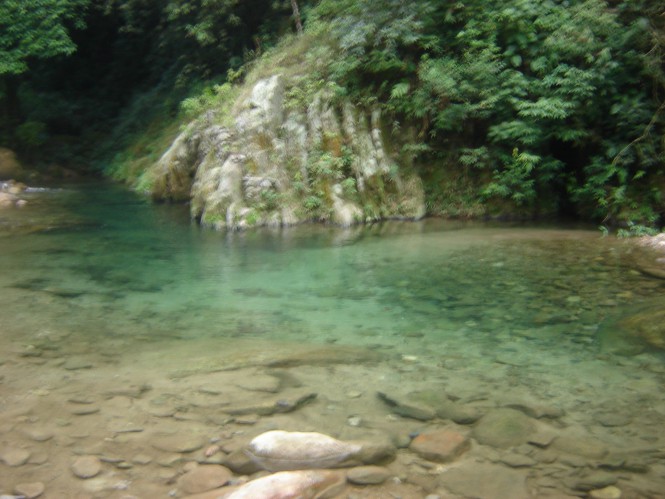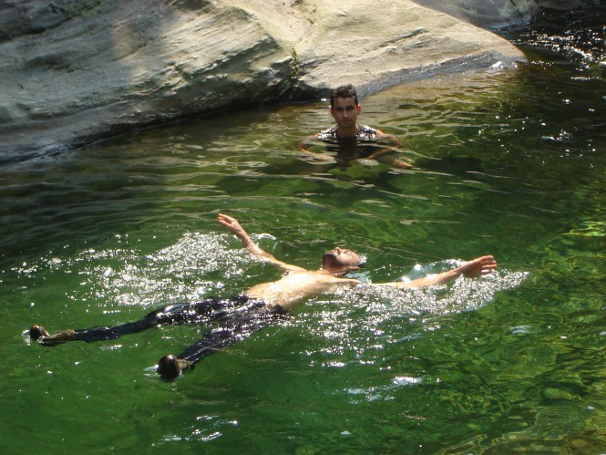 Enquanto a galera se divertia, fui cuidar de preparar o almoço. O sol estava muito quente e vez ou outra eu largava meus afazeres e me jogava na água. Dei muita risada e zoei muito o João Paulo, que tentava sem sucesso saltar do balanço. Ele só pulou porque eu e o Dema encarnamos na alma dele, já o Lindolfo nem se meteu a besta porque esse negócio de água profunda não é com ele,já que o único estilo que ele nada é o machado sem cabo(rsrsrsrsrsr).Pronto o almoço , nos reunimos todos na laje e ficamos comentando como tudo estava dando certo até ali, até agora tudo estava perfeito. Com a barriga cheia, alguns foram tirar uma soneca, eu e o Dema fomos tomar banho no poço que engole e depois de um descanso merecido, jogamos as mochilas às costas e partimos para outras paragens. Atravessamos o rio por onde a água escorre do poção e reencontramos a trilha do outro lado. Ela segue em nível, atravessa um córrego de águas cristalinas e em 20 minutos demos de cara com a barragem, que alguns também chamam de Poço do Quilombo.
