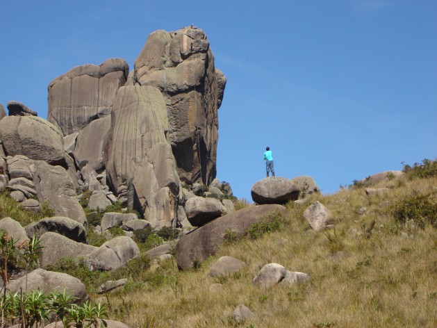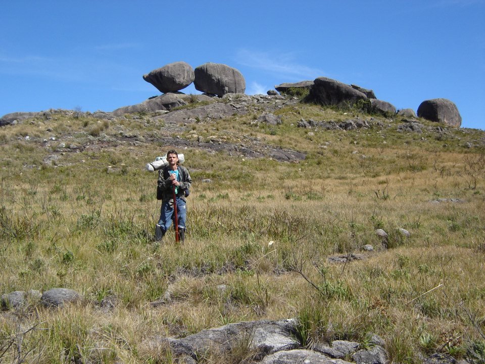 Mais uma vez o Rio Aiuruoca é cruzado, mas sem percebermos, estávamos deixando-o para trás e nem vimos a trilha que poderia nos levar até a famosa Cachoeira do Aiuruoca. Também não fiz muita questão de procurar a trilha, já que estávamos pra lá de atrasados. A nossa frente vai surgindo os OVOS DE GALINHA, formação rochosa deslumbrante. A trilha vai seguindo em nível e passa ao lado dos Ovos de Galinha, mas antes mesmo de fazer uma grande volta para a direita foi que percebemos que a trilha para a cachoeira havia ficado para trás e então tivemos que descer até o fundo do vale para abastecermos os nossos cantis. Retomamos nosso caminho até pararmos novamente em um dos ovos isolados, bem atrás da formação principal. O tempo está quente e não venta. A visão do Vale do Aiuruoca é realmente de encher os olhos. Minha vontade é de largar a mochila e escalar os Ovos de Galinha, mas logo me lembro de que estamos muito atrasados e então apresso meus companheiros e retomamos a caminhada, que vai subindo e ganhando altura lentamente até que alcançamos o selado, onde seria possível montar algumas barracas.