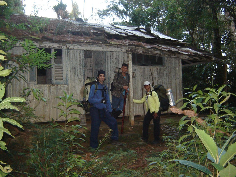 ..........” O Abrigo Macieiras, a exemplo do Abrigo Massena, não passa de uma tapera. Parte do assoalho afundou. Existem infiltrações por todos os lados, não há mais água nas torneiras, por isso sou obrigado a procura-la trinta metros a baixo junto a um riacho . O lugar é realmente macabro, lembra as casas de filmes de terror. Poderia servir muito bem de morada para espíritos malíguinos, demônios, assombrações, exus alados , seres extraterrestre e aventureiros céticos , como eu. Por ser minha última noite na travessia, resolvo fazer um banquete. Enquanto meu fogareiro faz sua parte, aproveito para dar uma organizada na casa. Encontro um velho cobertor pendurado na parede e uso-o para forrar minha cama. Estendo meu saco de dormir e acendo uma vela. Fico sentado na varanda olhando para floresta escura e pensando nas coisas de ruim que poderia ter me acontecido. Poderia ter quebrado uma perna, ser picado por uma cobra, ser arrastado pelo rio, atingido por um raio, cair no abismo, atacado por um enxame de vespas, sofrido um ataque cardíaco, ter sido estraçalhado por uma onça, me engasgado com a comida, ser atingido pela queda de uma árvore, escorregado e batido a cabeça no chão, ter morrido de hipotermia, etc..A relação de perigos imaginários ou reais são bastante grandes. Estar sozinho requer muito cuidado e uma boa dose de experiência no que se está fazendo. Sei que ainda tenho muito a aprender , mas depois de quase vinte anos perambulando por quase todo tipo de lugar, consegui adquirir um conhecimento que me faz caminhar por lugares ermos, como se estivesse no quintal de casa”......................
