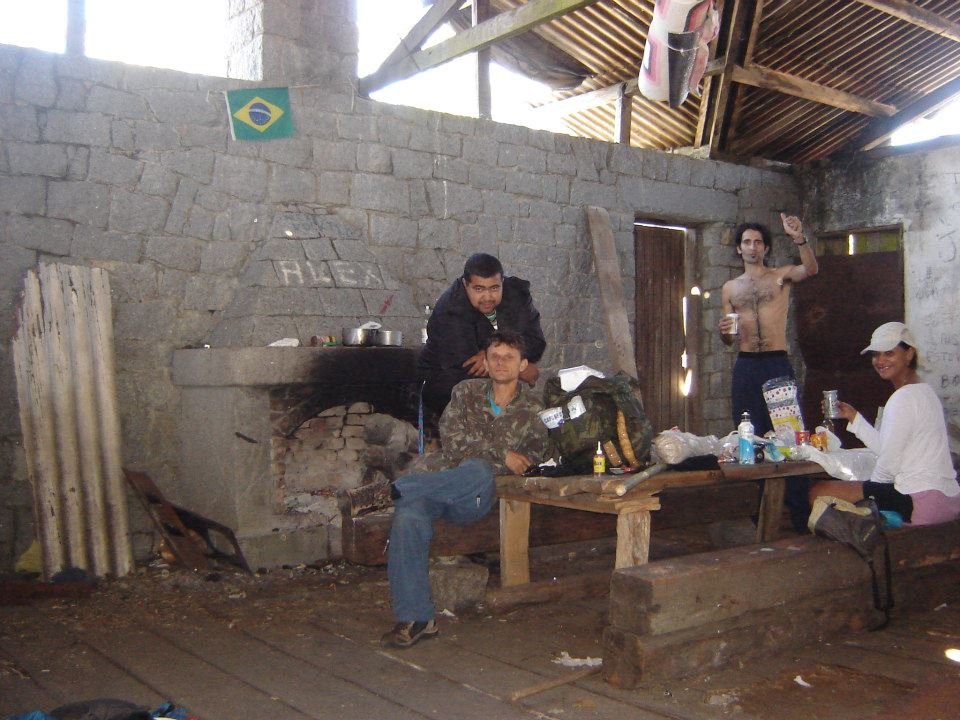 São 08 horas da noite quando abrimos a porta do abrigo, que foi construído há muitas décadas para ser uma pousada, mas hoje só sobraram a sala da lareira. Da mesma forma que o Abrigo Macieira, o Massena está abandonado a sua própria sorte. É outro patrimônio público fadado ao desaparecimento. Além de quase caindo, a sujeira tomou conta de tudo. Tentamos dar uma limpada no local para deixá-lo mais habitável. Aproveitamos a madeira que entulhava a frente do abrigo e acendemos a lareira. No que era sombrio, fez-se a luz e se encheu de calor. No abrigo, alem da lareira, uma grande mesa de madeira, um banco e um pequeno armário são os “móveis” que compõem o bucólico cenário. Como havíamos almoçado muito tarde, resolvemos apenas tomar um café. O Jony montou sua barraca, mas eu e o Fábio resolvemos apenas estender nossos isolantes sobre um plástico. Fomos dormir lá pelas 10 horas da noite, mas de madrugada acordo com uma dor de estômago terrível e com um frio devastador. Além do mais, os abalos sísmicos provocados pelos roncos do Fábio acabaram transformando nossos sonos em um verdadeiro inferno (rsrsrsrsr). Tomei um remédio e com a ajuda do Jony, que me emprestou um gorro e uma luva, voltei a dormir. Meu mal súbito eu não consegui descobri de onde veio, mas na falta de quem culpar, boto a culpa no desgraçado da pasta de amendoim.