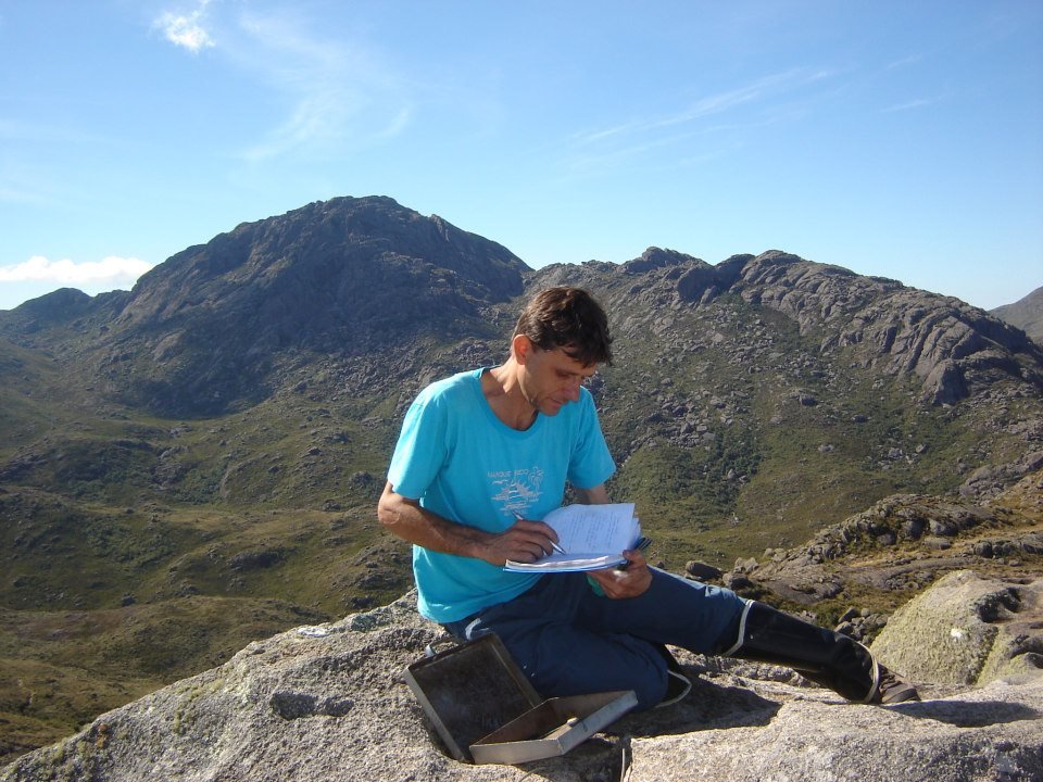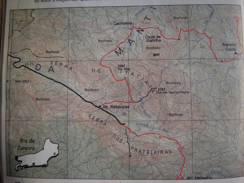 Dizem que é impossível chegar sem corda, que o caminho é confuso e perigoso. Como sempre “caguei e andei” para guia, apesar de ter alguns amigos nesta profissão, mandamos estes a merda e seguimos enfrente. O caminho passa por uma grande gruta, faz uma curva para a esquerda e depois de alguns trepa pedras, chegamos a uma grande janela, onde o melhor caminho é cruzando por baixo. Existem alguns lances perigosos, mas nada que não possa ser transposto. Depois começa a grande subida em direção ao cume da pedra. Não há propriamente um caminho a seguir, cada um tem que subir por onde acha que é mais seguro. Existe uma parte que é potencialmente perigosa. É preciso pular de uma pedra com uma altura de uns dois metros e meio, que fica junto a um abismo que não dá chance para haver erros. Depois é preciso confiar na aderência das botas e subir uma parede com uma enorme inclinação. Quem não está familiarizado com esse tipo de atividade, é melhor mesmo ficar tomando conta das mochilas na bifurcação da trilha. Finalmente 13:30 da tarde, eu e meu amigo Jony , atingimos os 2.548 metros do PICO DAS PRATELEIRAS.