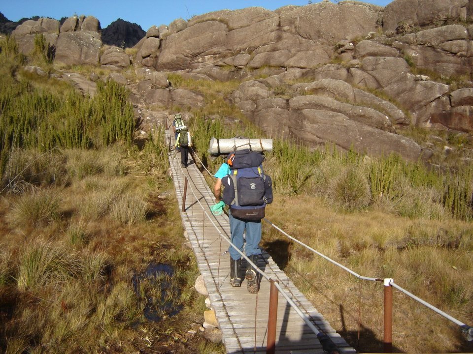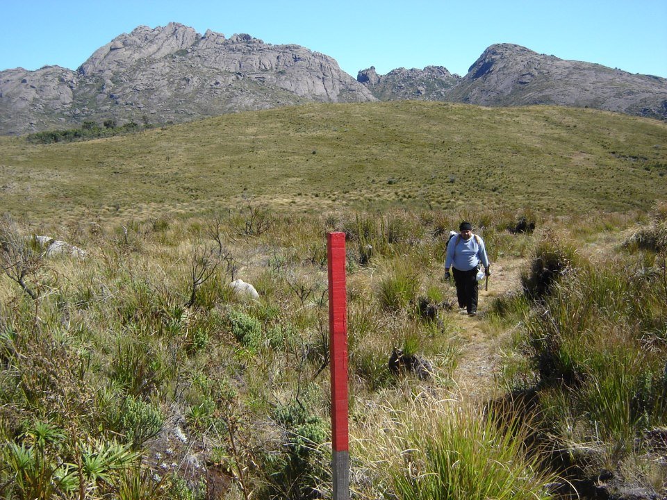 A trilha parte bem enfrente ao abrigo e logo entra na mata, onde um pequeno córrego abastece nossos cantis e em mais alguns minutos de subida chegamos a uma bifurcação. A trilha da esquerda é a variante conhecida como Trilha do Pinheirinho, que em um dia de caminhada atingirá a rodovia que parte da Via Dutra em direção a Garganta do Registro, a uns 10 km de Engenheiro Passos. Nosso caminho segue para a direita. Estamos bem nas costas das Prateleiras e teremos que fazer uma grande curva para esquerda até atingirmos o vale que nos levará para a Parte alta do Parque Nacional. A caminhada é tranquila e sem grandes desníveis. O cenário é lindo e pra todo lado que se olhe há algo para se admirar, caminhar em campos de altitude é mesmo um prazer do tamanho do mundo.