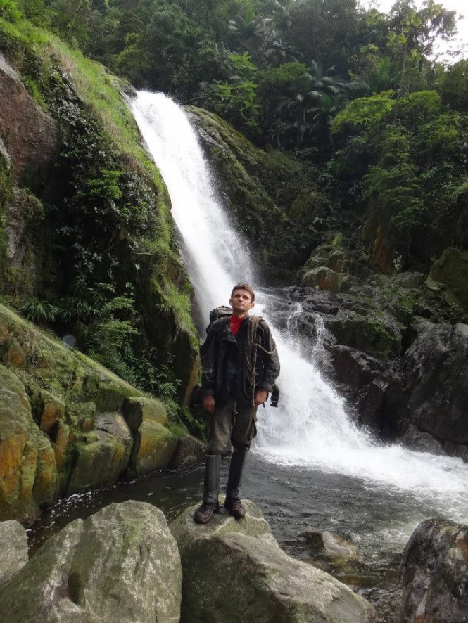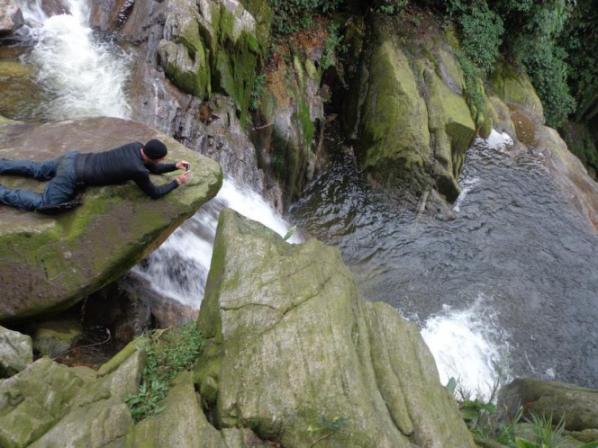 O Eduardo com sua faca “Rambistica” foi cortando a vegetação à sua frente e perdendo altura aos poucos bem de vagar e foi nessa hora que ele escorregou à beira do abismo e se “despirocou” no vazio. Eu e o Lindolfo ainda estávamos lá parados, fazendo a alegria dos borrachudos e outros tantos de insetos devoradores de gente quando ouvimos um barulho de “gente se fudendo” no buraco (rsrsrsrsr). Dei um grito chamando pelo “homem voador” e como resposta recebemos um grito que indicava que ele ainda estava vivo. Estiquei a corda e fui descendo o barranco à minha frente. O barranco na verdade era uma grande rocha, que tornava a descida negativa, ou seja, tem uma horaque você não tem mais pedra para apoiar os pés e aí desce ralando tudo, ainda mais porque a mochila insiste em te jogar no vazio. Depois que eu desci, veio o Lindolfo logo atrás lixando a cara na rocha. Uma vez lá embaixo puxei a corda e a desgraçada insistiu em ficar enroscada ao redor da árvore logo acima. Vai eu trepar de novo na pedra para retirar a corda presa na raiz e depois descer de novo, mais uma vez fazendo papel de queijo parmesão. Escorregamos mais que depressa pelo terreno acidentado, tentando ganhar tempo para ver o que tinha acontecido com o Eduardo. Fui o primeiro a chegar ao lugar de onde ele havia caído. Era uma parede rochosa de uns quatro metros de altura e vi logo que ao cair o menino levou consigo um mundo de vegetação, entre cipós, trepadeiras e toda sorte de plantas espinhuda. Ele deu sorte, foi salvo porque caiu com a mochila às costas, o que acabou lhe amortecendo a queda. Essa foi por pouco, ”hem”amigão?