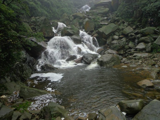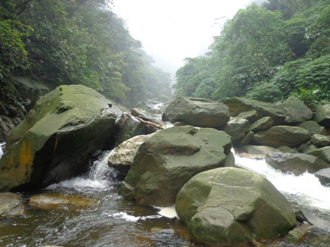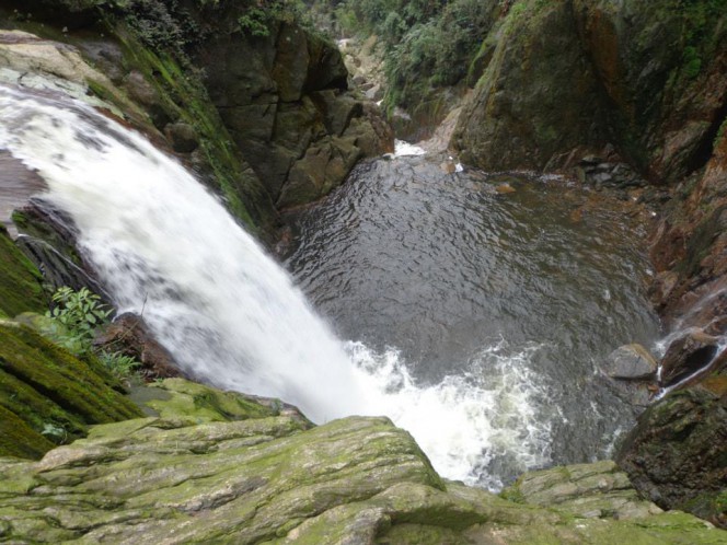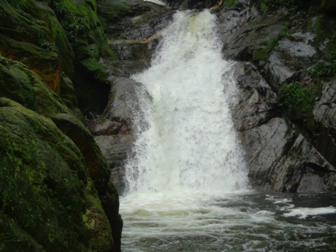 Levantamos lá pelas 09h00min horas, desarmamos nossas redes, tomamos café e partimos às 10h00min. À beira da Cachoeira da Fumaça, os desbravadores da terceira idade oravam à beira do abismo. O tempo se mantinha ruim e com muita neblina, mas como Paranapiacaba significa: lugar de onde se pode (às vezes, quem sabe, talvez, se deus ajudar, rsrsr) ver o mar, eu ainda tinha uma esperança de que o tempo melhorasse. Passamos pelos adventistas, que não iriam muito longe mesmo, atravessamos o rio para sua margem esquerda e já nos deparamos com uma rampa íngreme, lisa, escorregadia e perigosa. Pensei: se essa é a parte turística da caminhada,estamos lascados! E estávamos mesmo! Descer aquela rampa com uma mochila enorme nas costas não era fácil não, um descuido e você e a mochila iriam conhecer a dureza da rocha montanha abaixo. Não há no que se segurar, sua bunda é seu freio e o seu freio reserva é a sua mochila, se isso falhar, teria sido bom ter ficado rezando no topo da cachoeira porque nada mais poderá salvar a sua pele. Com dificuldade, descemos aos pés da primeira queda e logo descobrimos que a trilha não seguiria somente pela esquerda do rio, teríamos que ficar costurando de um lado para o outro. Cruzando- o, portanto para o outro lado, nos enfiamos no meio do mato e logo tivemos que esticar nossa corda para conseguir descer um lance escorregadio. Passamos a corda em volta de uma árvore e nos jogamos na rampa escorreguenta e logo atingimos a segunda queda. Desta maneira as cachoeiras e seus poços foram se sucedendo, mas ninguém quis se ariscar em um mergulho, já que o sol ainda não havia dado as caras. Logo passamos pela cachoeira do Rio vermelho e chegamos à confluência com o rio Solvay. Na verdade Rio Solvay, Vermelho e Rio das Pedras se unem para dar vida ao fabuloso Rio da Onça.