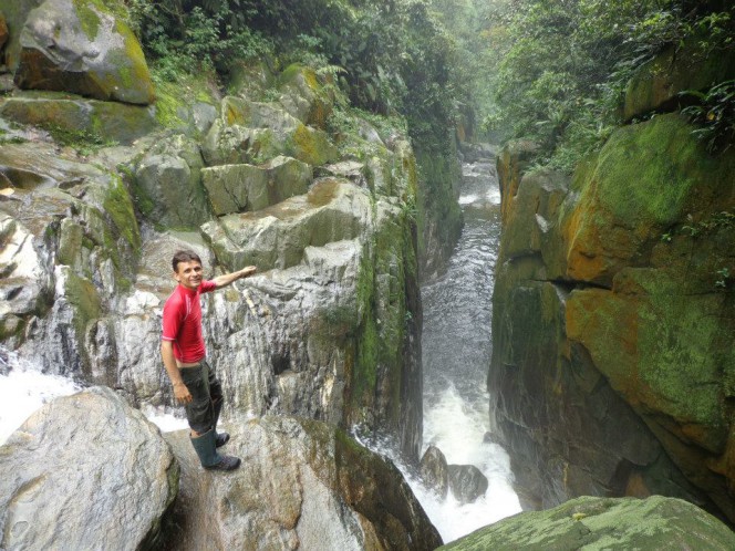 O engraçado e que todos ficamos com os nervos a flor da pele e houve até um princípio de discussão, já que o Lindolfo insistia em dizer que a gente já havia passado por ali em 2011, quando fizemos a caminhada pelo Rio Quilombo e Mogi e aí acabamos subindo por meia hora o Rio da Onça. Com a cabeça no lugar, resolvi escalar a parede da direita e ver o que eu conseguia achar morro acima, mas como a parede junto ao Canyon era muito íngreme, eu tinha quase certeza que seria esforço à toa. Pois bem, mais uma vez me agarrei à vegetação e fui ganhando altura e logo vi que havia uma passagens beirando o abismo. Era quase um degrau à beira da parede e vendo que o caminho poderia nos render alguma coisa, chamei o Eduardo e o Lindolfo para seguirmos viagem. O Eduardo foi à frente abrindo caminho e como o vestígio de trilha se mantinha quase plano, fomos ganhando terreno rapidamente, tentando escolher a hora certa para podermos descer ao rio da Onça. Pelas marcas de corte de fação podia-se notar que aquela era uma trilha, muito antiga, mais era uma trilha. Mas logo a nossa sorte acabou de vez. A trilha parou bem numa laje escorregadia, onde dali ninguém mais passaria, para desolação total. “ Nesse momento fiquei pensando que era mais fácil conseguir escapar da” CAVERNA DO DRAGÃO” do que conseguir sair do Vale da Morte.
