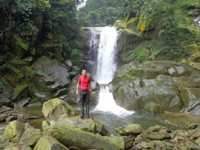 Chegando à estação de Rio Grande da Serra, atravessamos a linha de trem, viramos à direita e estacionamos no ponto de ônibus onde embarcamos quase que imediatamente para o distrito de Paranapiacaba . Mas nosso destino não seria a vila inglesa. Quando o ônibus passou a placa do KM 45 da rodovia, o motorista estacionou à direita junto às torres de alta tensão, no exato local onde começa a famosa Trilha da Cachoeira da Fumaça. Eram exatos meia noite e não estávamos sós. Iam nos fazer companhia mais de 20 desbravadores sêniors da Igreja Adventista. Para evitar a muvuca, partimos à frente e nos primeiros metros já fomos obrigados a enfiar os pés na lama e nos ”segundos metros” já estávamos com a água na altura dos joelhos. Não dava para saber o que era rio e o que era trilha. Chuviscava um pouco e uma névoa branca cobria parte da nossa visão. O caminho é bem largo e ás vezes se anda por uma canaleta erodida, onde alguns riachos são cruzados. Na escuridão, iluminávamos nosso caminho com as lanternas e não era raro afundarmos quase até a cintura naquele aguaceiro todo. Pouco tempo depois chegamos ao Rio das Pedras e o cruzamos para o outro lado e foi aí que a trilha se bifurcou: uma seguia perpendicular ao rio e a outra ia paralela, sem saber qual tomar, decidimos não nos afastar do rio e continuamos paralelos a sua margem esquerda, depois a trilha virou de vez para a direita e aí tivemos que cruzar o rio, bem onde despenca uma cachoeira. Já era mais duas da manhã e o Lindolfo queria acampar de qualquer jeito, ainda mais quando ele viu que teríamos que seguir pelo leito do rio. Eu e o Eduardo estávamos obstinados a chegar ao tal acampamento do alto da Fumaça e então eu desci ao lado da pequena cachoeira e dei de cara com um animal que nos espiava de sua base. Parecia uma raposa, mas quando jogamos nosso facho de luz o bicho “picou-a-mula” pro mato e então desescalamos a queda d' água e fomos seguindo vagarosamente pelo leito do rio sob o protesto do Lindolfo. Não caminhamos muito e logo sem percebermos o mundo acabou sob os nossos pés.