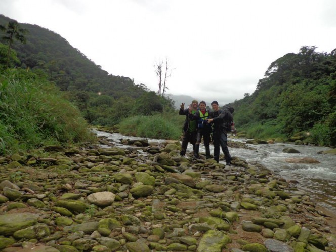 Caminhamos mais uns 200 metros e nos encontramos de vez com o majestoso Rio Mogi. Se mil vezes passar por aqui, mil vezes a minha alma se alegrará por ver esse rio tão cristalino. Paramos ali na confluência do Rio da Onça com o Rio Mogi e tiramos aquela foto clássica, que marca oficialmente o final da Travessia do Vale da Morte. Final da travessia, mas não final da caminhada, porque aqui temos três destinos a tomar: Subir o Rio Mogi por umas 3 ou 4 horas e depois pegar a trilha que sobe para Paranapiacaba por mais 3 ou 4 horas. Descer pelo rio por mais uns 20 minutos e interceptando uma trilha a esquerda sair na estação Raízes da Serra e depois caminhar por mais uma hora até a rodovia e pegar um ônibus para Cubatão. E a terceira e mais radical é caminhar até a Estação de trem Raízes da Serra e depois logo à frente subir por uma trilha até interceptar a antiga ferrovia Funicular e subir por ela por mais um dia até Paranapiacaba.