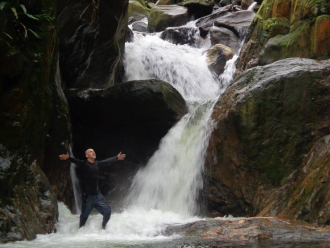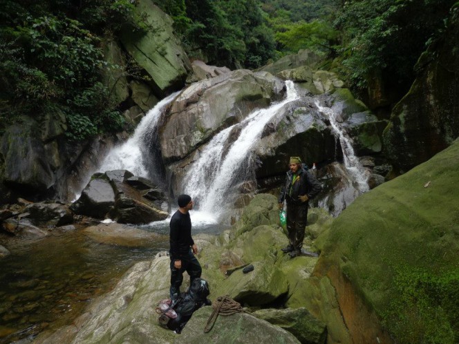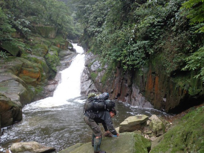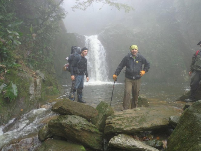Não há onde se segurar, vamos cravando as unhas na terra e quando dá, vamos nos grudando em cipós e plantas espinhudas. As urtigas vão roçando no rosto e no pescoço e os mosquitos e formigas acabam por dar cabo dos outros centímetros de pele que ainda haviam se preservado. Quando era possível, colocávamos a corda para tentar passar de um lugar a outro ou mesmo para descer uma rampa mais íngreme e quando não dava tempo, a lei da gravidade se encarregava de nos mostrar o caminho a seguir. Depois de ganhar bastante altura, vimos que estávamos caminhando em uma crista dentro da floresta, onde um córrego corria a nossa direita e a nossa esquerda era impossível descer. Resolvemos seguir por essa crista, já que ficamos com medo de descer a esse afluente do rio da Onça e darmos de novo em outra grande cachoeira. Assim que a crista arrefeceu um pouco, resolvemos perder altura e descemos o barranco àesquerda, onde o Lindolfo escorregou e ficou pendurado por uma só mão, sendo salvo pelo bastão de caminhada. Queríamos voltar ao rio da Onça de qualquer jeito e foi por uma rampa de pedra, que mais parecia o leito de um rio seco, que usamos para escorregar até lá embaixo. A última parede foi vencida com a corda e às 13h00min desembocamos na Cachoeira Confluência e ali desabamos de cansados.