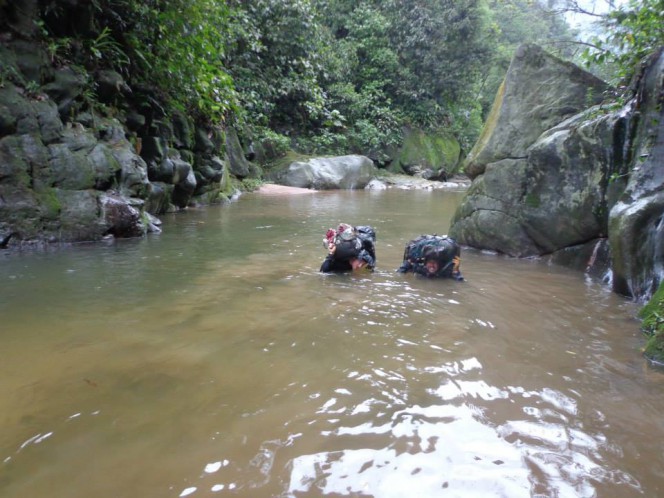 A moleza acaba logo à frente quando de novo o rio volta a ficar emparedado. É uma parede baixa, mas nós não conseguimos encontrar nenhum caminho fácil para passar por fora do rio e então resolvemos atravessar um pequeno poço, passando as mochilas com a corda e depois nadando de um lado para o outro. Passadas as mochilas era só pular com roupa e tudo no rio profundo e já agarrar-se nas pedras do outro lado. Foi aí que o colete salva vida que eu havia levado se fez necessário, já que o Lindolfo não sabia nadar. Mais algum tempo de caminhada pelo rio e novamente tivemos que abandoná-lo. Ficamos ali por um bom tempo analisando e matutando, tentando escolher qual o melhor caminho a seguir, pela direita ou pela esquerda. Resolvemos de comum acordo tentar seguir pela direita, ou seja, montanha da direita. Por uma rampa mais que escorregadia e com pedras soltas, fomos subindo, tentando nos segurar onde desse. Assim que chegamos mais acima, viramos para a esquerda e fomos perdendo altura e voltando em direção ao rio e logo já estávamos mais uma vez aos pés de outra cachoeira.Depois seguimos por mais algum tempo pelo rio que de novo nos fechou a passagem, num abismo impressionante, de onde uma pedra que avançava no vazio nos fazia lembrar o famoso mirante da Chapada Diamantina.É, é muito lindo mais daqui a gente também não passa, não seguindo o rio. Mais uma vez optamos por sair pelo morro da direita, subindo outra rampa nos agarrando na vegetação. Mas essa não é mais uma passagem, mais um corte de caminho a fim de nos livrarmos de mais um Canyon e conseguir mais uma vez voltar ao rio, um pouco mais abaixo. Essa é uma das passagens mais miseráveis desta travessia, uma passagem que exigirá de todos uma concentração, uma autoconfiança e acima de tudo, manter a cabeça fria, porque essa passagem vai minar todas as nossas forças e senão tomar cuidado, vai jogar o moral do grupo na lama .