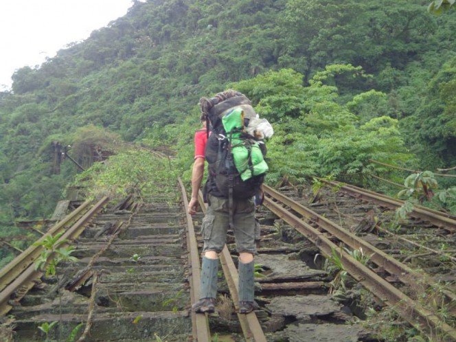 Cruzamos a ponte, cada um como pode e como se sentiu seguro, uns em pé, outros de quatro, outros de joelhos. Chegar vivo do outro lado é o troféu. Seguimos de novo pela trilha e mais um túnel aparece pela frente, talvez o maior de todos, onde tivemos que usar uma lanterna. Os túneis estão bem preservados e é possível acampar dentro de quase todos. As pontes vão se seguindo e cruzamos por cima de algumas, mas praticamente em todas é possível desviar por trilhas e foi isso que fizemos em pelo menos metade delas, porque acabava sendo mais rápido do que ficar se arrastando nas pontes em ruínas. A cada patamar que íamos cruzando, as ruínas das máquinas, caldeiras, e todo tipo de instalaçõesnos fazia acreditar que estávamos diante de uma das mais espetaculares obras que esse país já teve. Uma verdadeira Machu Picchu ferroviária perdida e abandonada.