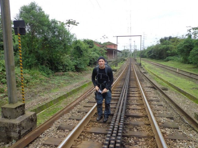 Um clássico dos anos 80, vindo do celular do Lindolfo, nos despertava para mais um dia de caminhada e a música parece mesmo que havia sido feita para aquela ocasião. Arrumamos as mochilas e partimos, subindo pela mesma trilha que havíamos chegado na noite anterior. Por incrível que pareça a trilha estava um pouco fechada, o que indica que a Funicular não estava sendo tão usada como pensávamos,talvez a fiscalização em Paranapiacaba tenha aumentado ou talvez as pessoas estejam indo mesmo somente até uma parte da ferrovia, a parte onde as pontes estão em melhor condição para serem atravessada. Sempre pensei que a caminhada da Funicular era feita sobre os trilhos, mas vejo que me enganei. Os dormentes praticamente não existem mais e os trilhos passam ao lado de uma trilha, o que torna o caminho muito legal para caminhar. Mas essa não é uma caminhada turística, é uma caminhada ariscada, onde pontes de quase uma centena de altura terão que ser cruzadas, e são pontes totalmente destruídas e carcomidas pelo tempo, onde um descuido pode levar a um tombo fatal no abismo. Passamos por alguns túneis, que não sei se é verdade, dizem que foi escavado a mão. São obras realmente inacreditáveis, já que foram feitas há quase 150 anos atrás, o que nos faz acreditar que muita mão de obra escrava foi usada por aqui. E eis que de repente surge em nosso caminho a primeira ponte a ser cruzada.MAIS QUE DESGRAÇA É ISSO? Era uma ponte que mau se segurava em pé, com os dormentes que já havia se dissolvido pelo tempo. São dois pares de trilho e no início fomos caminhado com um pé em cada trilho, afastados uns 30 centímetros um do outro. Eu fui em pé, prendendo a respiração e andando o mais ereto possível para que a minha mochila não desequilibrasse e me jogasse no vazio. O Lindolfo não se fez de rogado, ajoelhou nos trilhos e foi implorando a deus que o sofrimento acabasse logo (rsrsrsrs). Até a metade da ponte, onde era possível manter os dois pés paralelos aos trilhos, eu fui bem, mas depois, quando os trilhos de transformam em apenas um eu fui obrigado a passar para o lado de fora da linha férrea ,ou seja, andar à beira do abismo. Pra piorar começou a chover bem no meio da travessia, o que deixava os trilhos escorregadios. Concentração, respiração presa, olhos fixos nos trilhos, mochila equilibrada, MAS QUE DIABOS MESMO EU ESTOU FAZENDO AQUI?