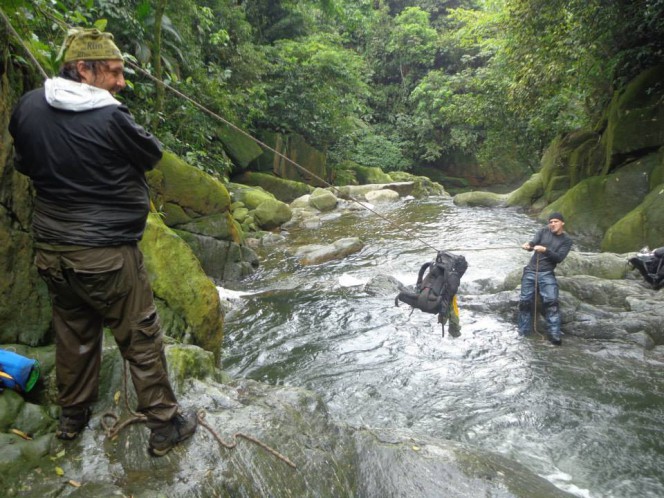 Uma coisa a gente tinha certeza, aliás, a única certeza de toda a travessia: para seguirmos enfrente, o único caminho seria pelo lado esquerdo do rio, porque pelo lado direito e pelo rio seria totalmente impossível. Alimentados, cruzamos o rio e fomos escalando o barranco do lado esquerdo. Era um barranco liso e escorregadio, onde a vegetação rasteira praticamente não servia como apoio. Era preciso cavar o barranco com os pés e alcançar alguma árvore mais acima de sua cabeça e ainda ir tomando cuidado com as rochas que iam rolando como boliche e atingindo o companheiro mais abaixo. Vencida estas dificuldades, chegamos bem acima do rio, em um lugar onde a vegetação se abre um pouco e nota-se que a “trilha” se bifurca em duas: Uma segue subindo para esquerda e a outra segue descendo à direita. Sem saber qual pegar, escolhemos seguir pela direita, onde o Eduardo tomou à dianteira e foi abrindo caminho pela vegetação meio fechada. Estava claro que alguém havia passado ou tentado passar por ali há muito tempo, mas nós não tínhamos a certeza se esse seria mesmo o melhor caminho a tomar. E não era mesmo, pois logo o caminho se perdeu na beira de um barranco de uns quatro metros de altura. O cansaço chegou, o sol já estava nas últimas e o Lindolfo já queria acampar de qualquer jeito. Até daria para esticar nossas redes nas árvores ao redor, mas não tínhamos nem uma gota de água e ainda estávamos imundos de barro e eu não queria passar a noite ali naquele lugar medíocre. Queria mesmo era chegar à beira do rio e desfrutar de uma noite com um mínimo de conforto. Jogamos nossa corda e o Eduardo escorregou no buraco e desceu até a sua base. O Eduardo seguiu descendo e abrindo o mato, na esperança de traçar um caminho até a margem do Rio da Onça. Eu e o Lindolfo nos mantivemos no mesmo lugar esperando o aval do Eduardo para também nos pendurarmos na corda e descer o barranco, já que uma vez lá embaixo não haveria como retornar depois que a corda fosse retirada.