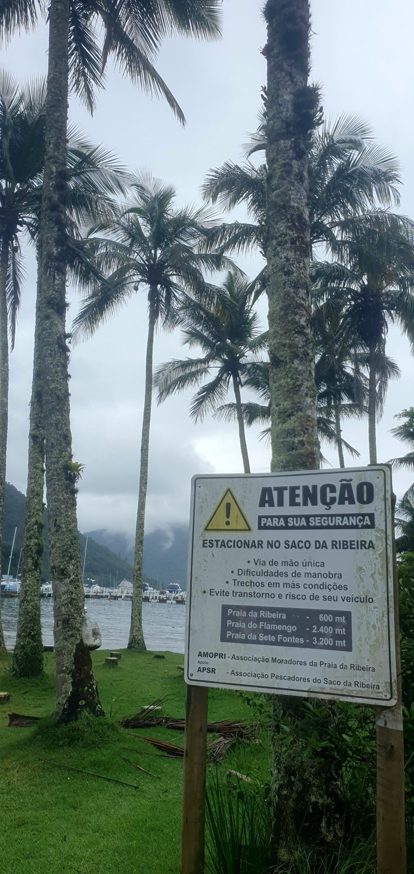Deixamos o centro, passamos pela enorme Praia Grande na direção sul e uns 15 km depois , abandonamos a Rio-Santos pegando o acesso para o SACO DA RIBEIRA . Aqui na Ribeira é onde nos sentiremos um nada economicamente diante da quantidade de lanchas, barcos e veleiros que por certo chegam a custar milhões, mas não viemos para reclamar do sistema e nem das desigualdades sociais que assolam esse país, pelo contrário, estamos aqui para nos desapegarmos do máximo de coisas que conseguimos, então largamos nosso carro num quase final de estrada, onde uma placa nos avisa das dificuldades de seguir enfrente motorizado, jogamos uma pequena mochilinha às costas, contendo o mínimo do mínimo e nos pomos a caminhar, sem pressa, sem compromisso com coisa nenhuma.