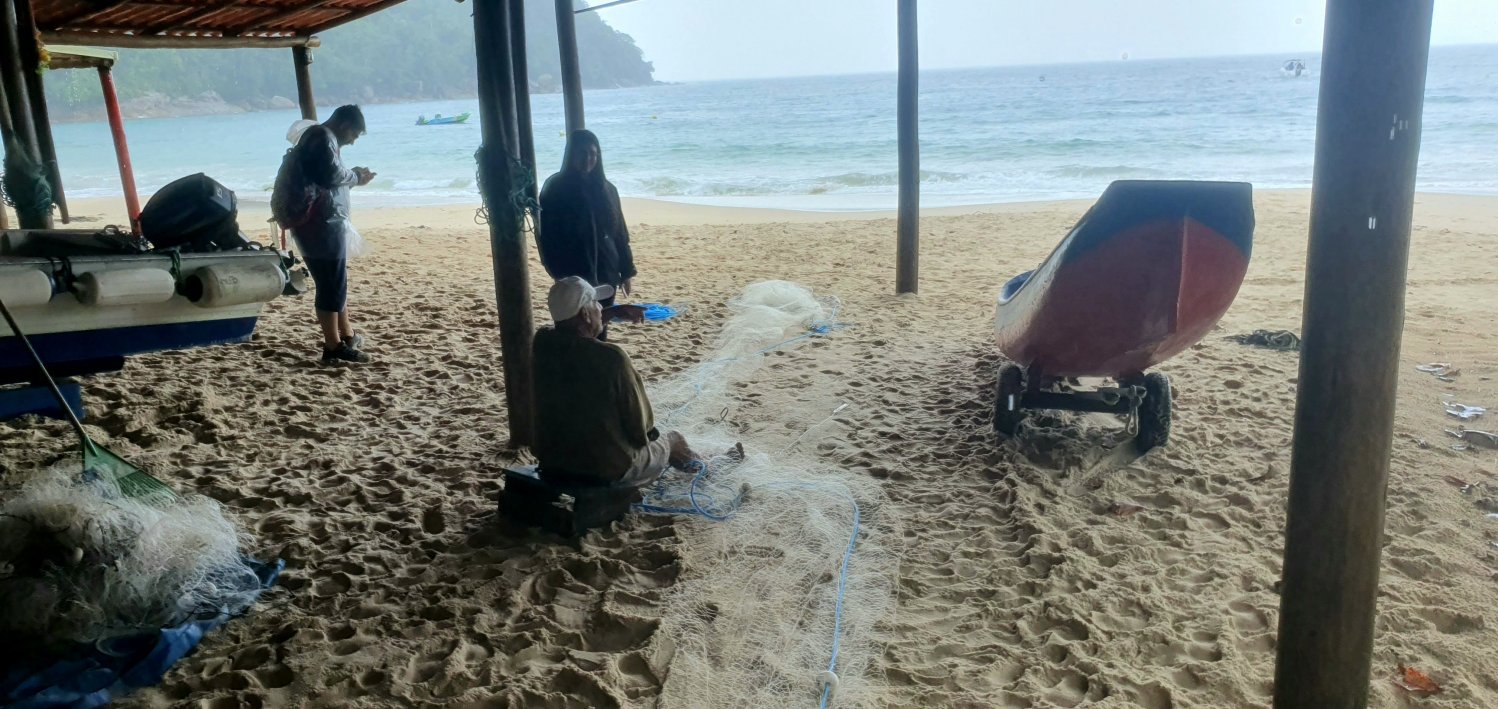 Ficamos sós, apenas nós 3 numa praia isolada , com um tempo cretino, um chuvinha fria que varre tudo . Os bares estão todos fechados , mas um pescador , aproveitando que o mar não está pra peixe , conserta sua rede e ficamos lá, jogando conversa fora com o pescador e admirando a beleza insólita daquele oceano que parece não querer nada com gente.