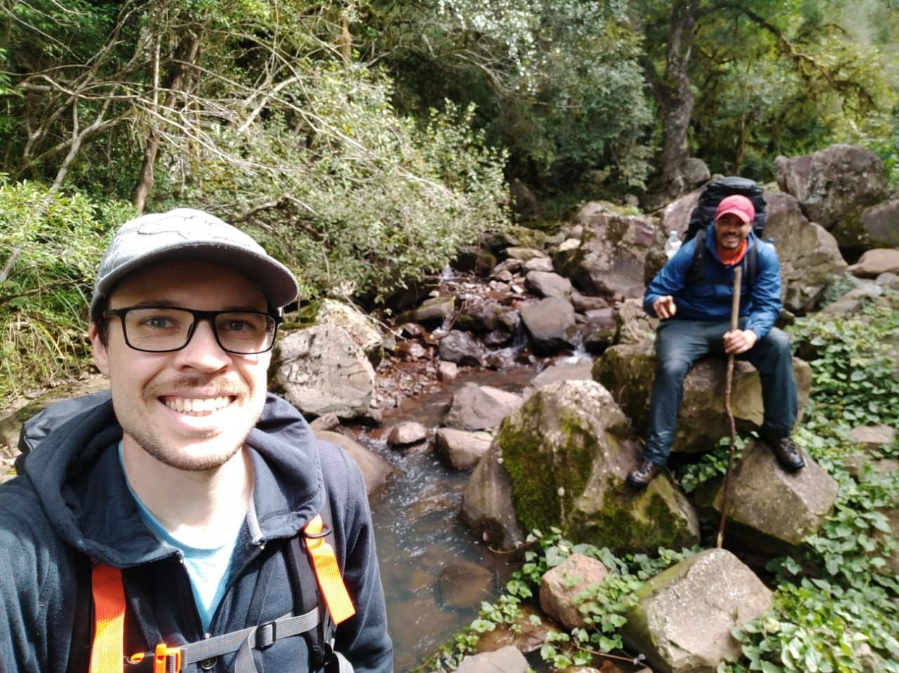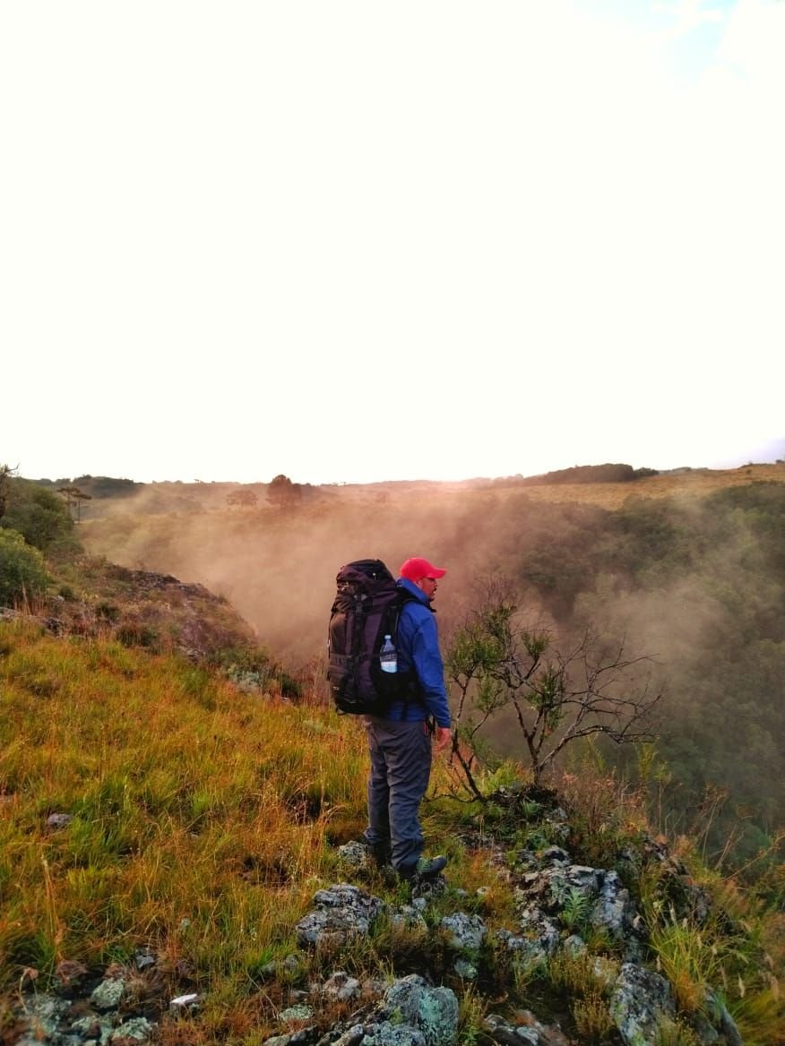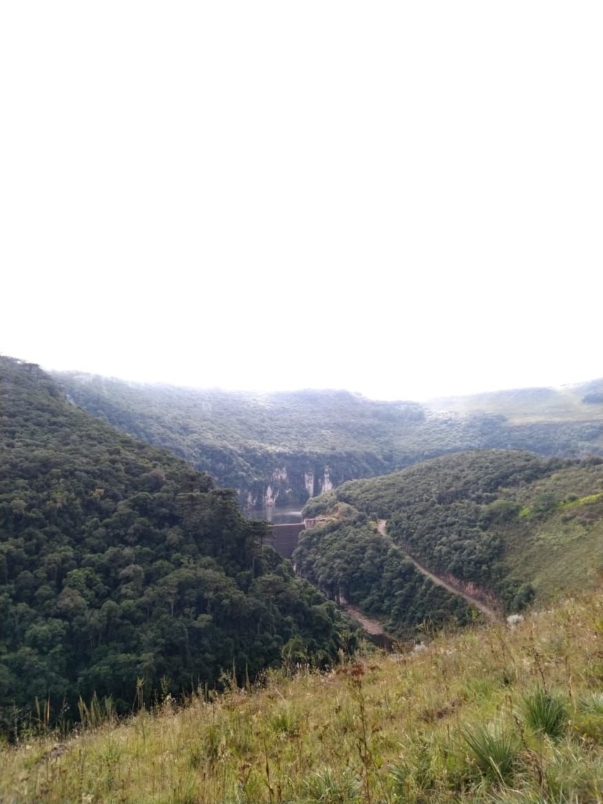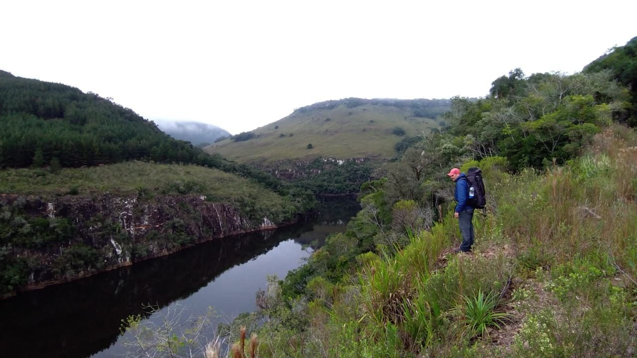 9:30 já com o acampamento desmontado e sem o sol aparecer décimos fazer a travessia já que tínhamos tempo e o clima estava agradável para percorrer um caminho maior . E assim fizemos começamos a decida pela lateral do cânion que nos levava até uma hidroelétrica aonde passaríamos e depois chegaria no rio .