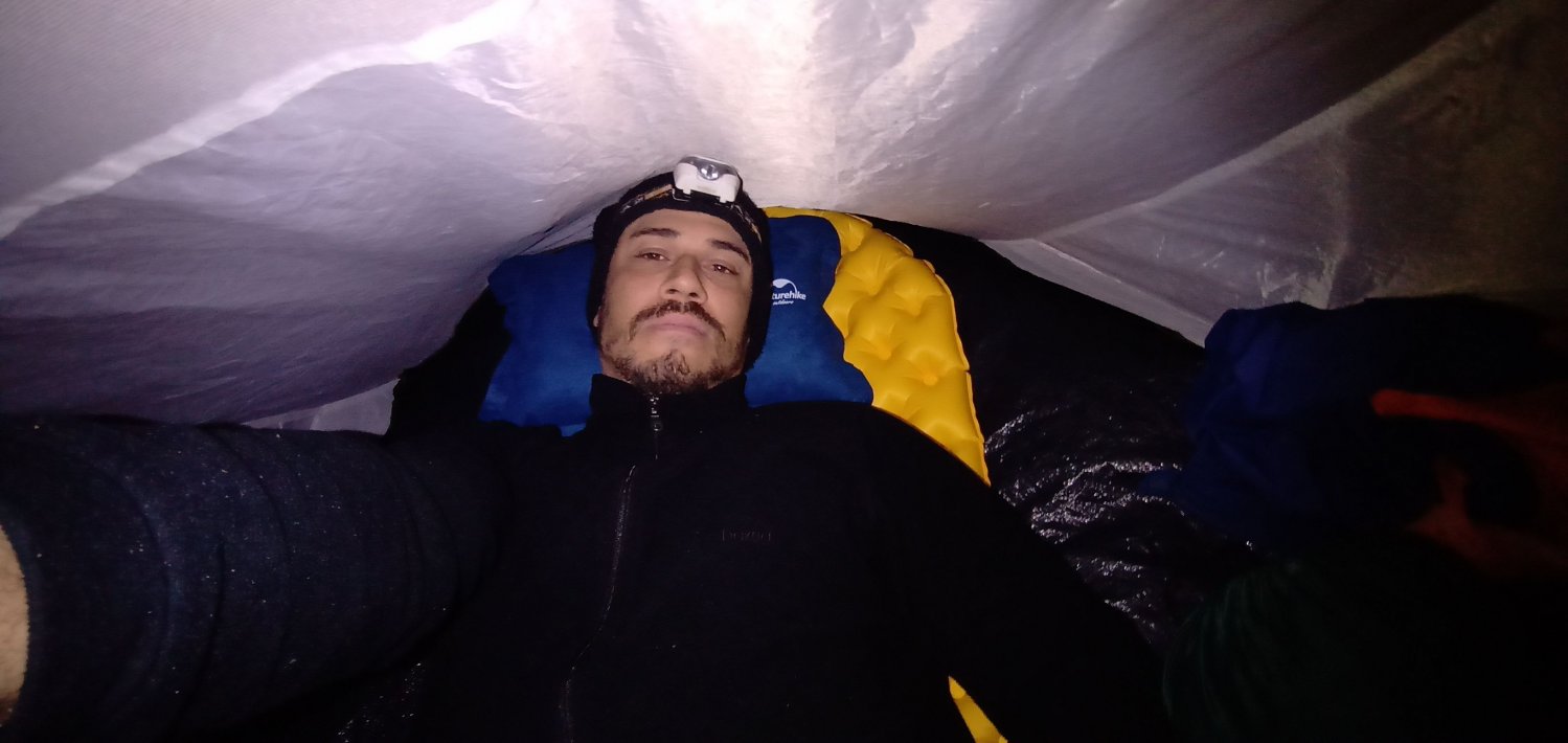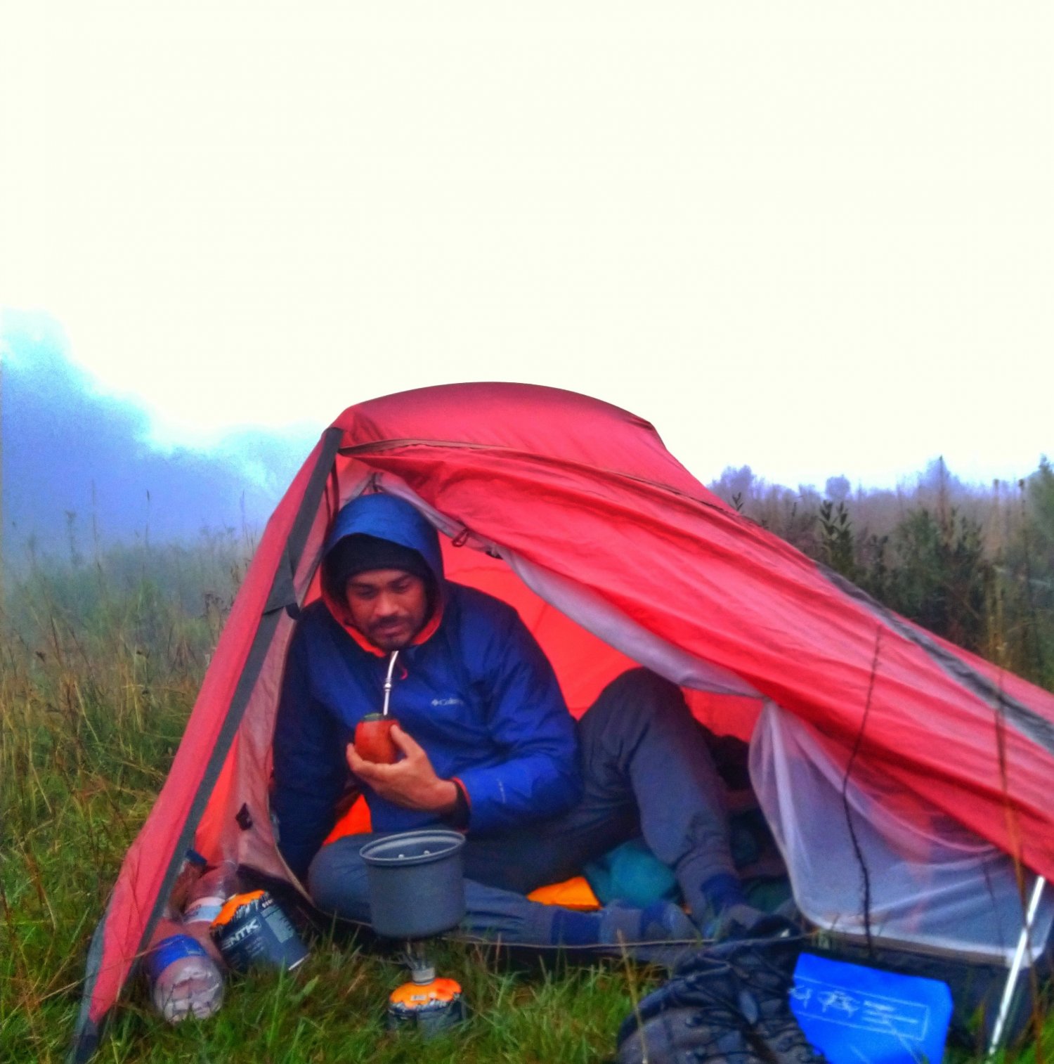 O tempo estava mundando rapidamente e já estava se aproximando uma cerração , então montamos acampamento e começamos a nós acomodar , a cerração fechou todo nosso acampamento e nos obrigou a entrar dentro das barracas .