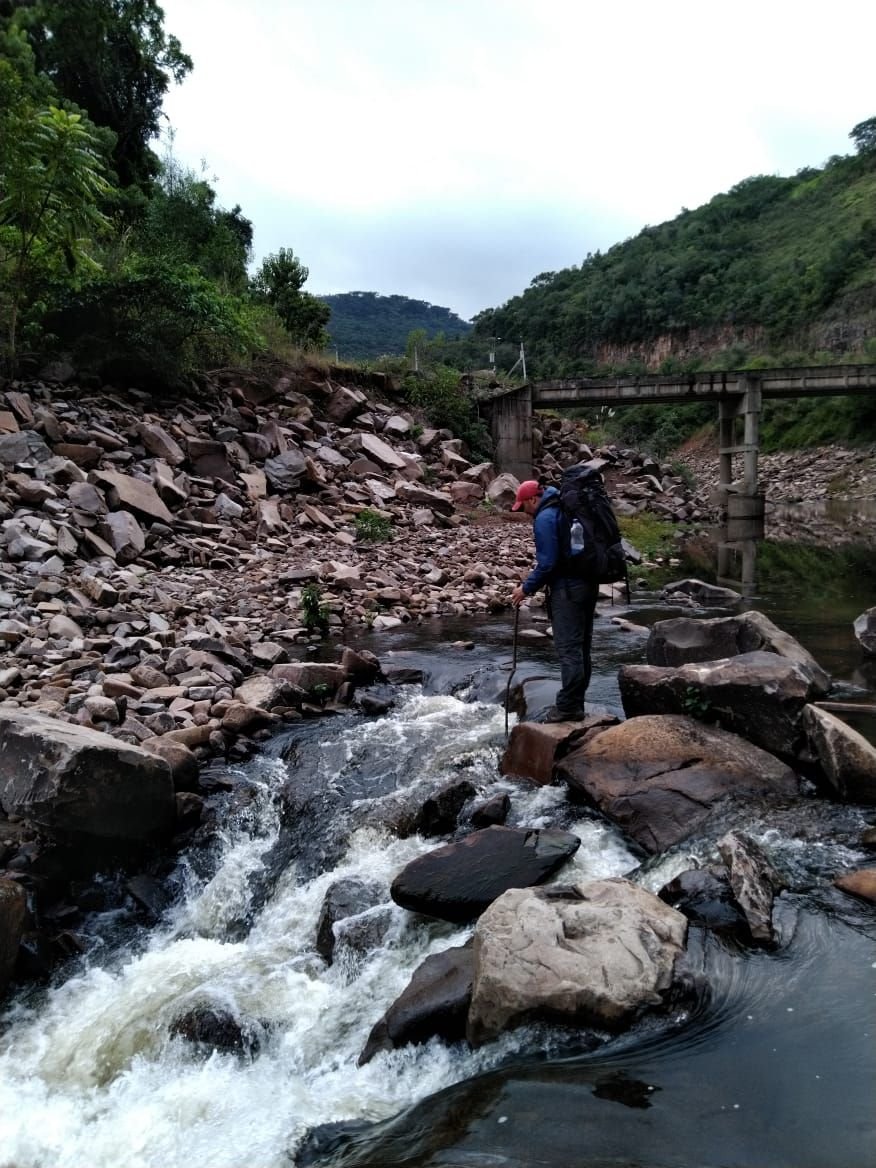 Chegamos na hidroelétrica , passamos a cerca e logo seguimos em direção ao rio que nos levaria de volta ao cânion palanquinhos , escolhemos caminhar pela lateral do rio costeando , só que não foi uma boa escolha ,demoramos muito por esse caminho , tínhamos que subir e descer Pedras molhadas e escorregadias . A melhor opção é entrar na água e ir atravessando o rio por dentro .