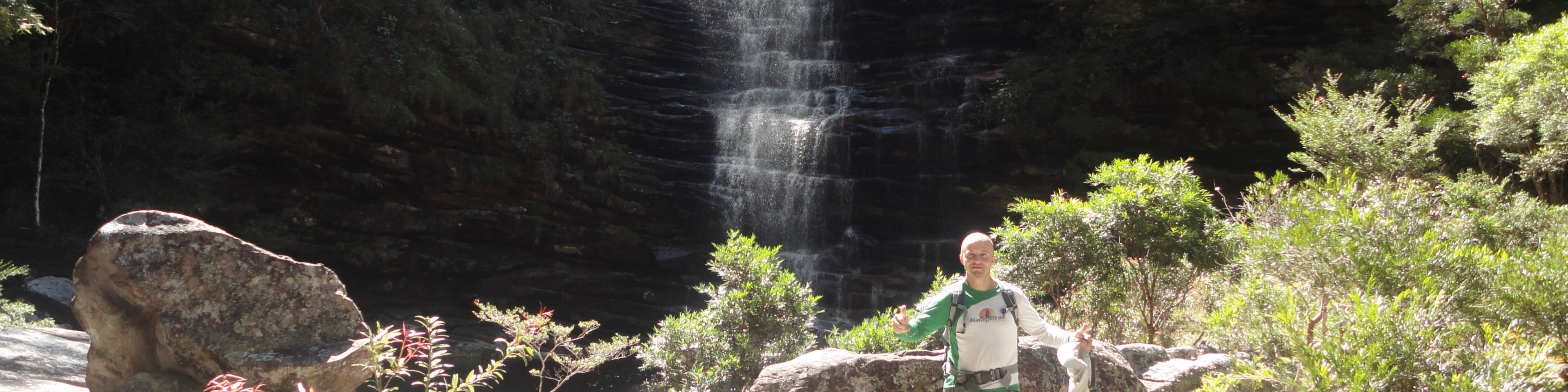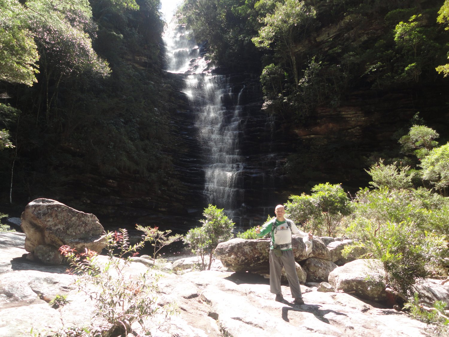 Márcio Rios com a Cachoeira do 21 ao fundo! Pouco volume d'água!