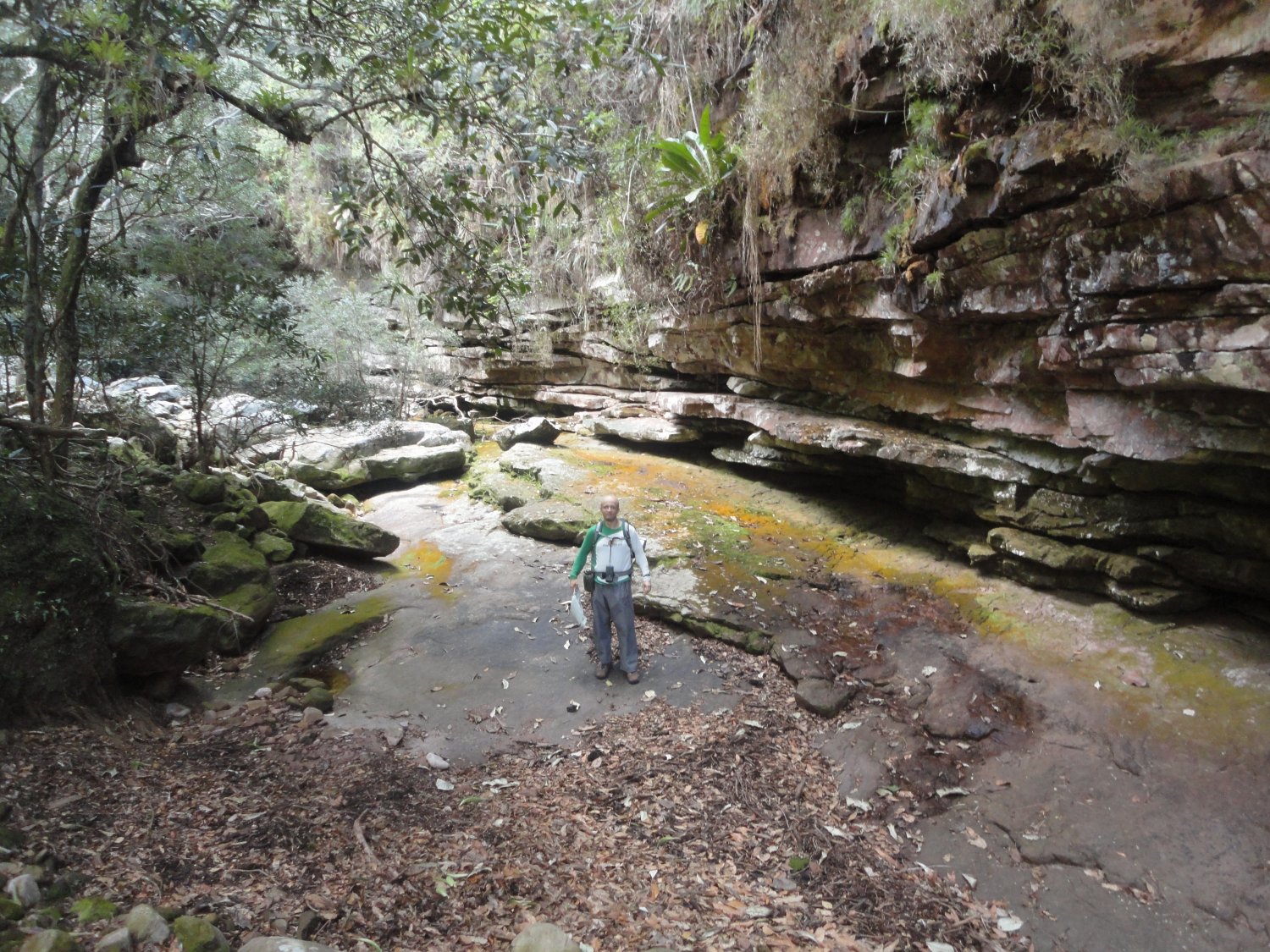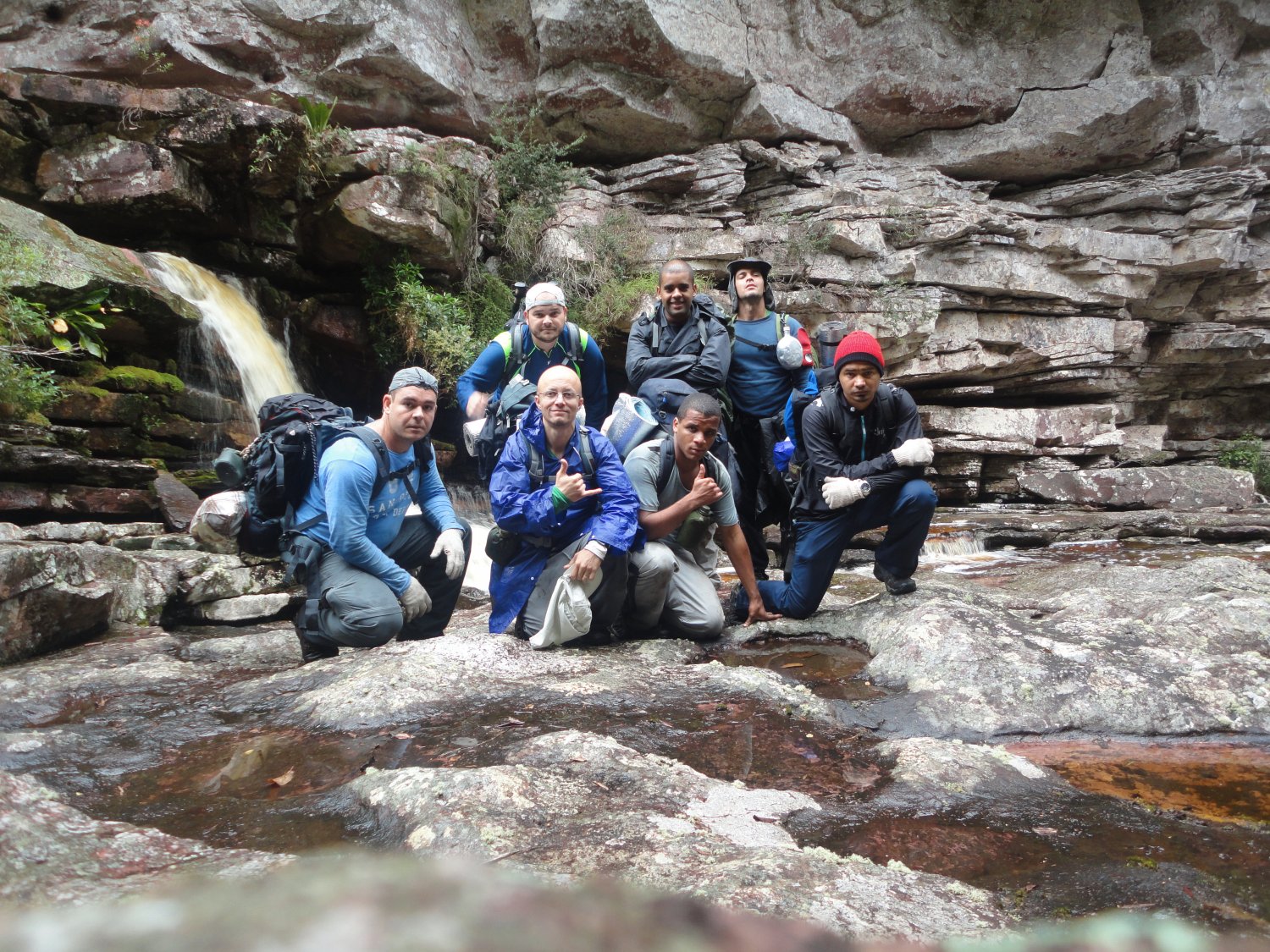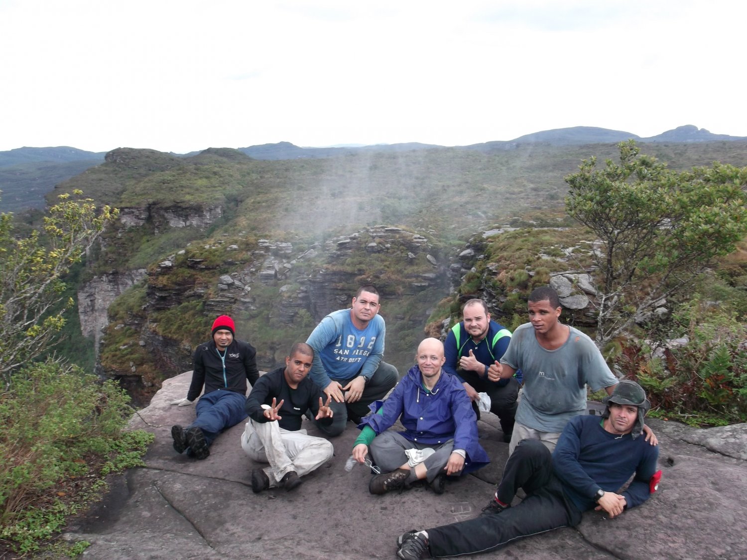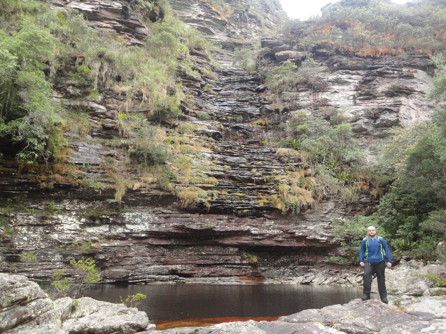 Para mim, muito misteriosa, com um quê de selvagem e perigo devido aos relatos e vídeos postados na net. Já havia feito Lençóis-Capão pela trilha das Mulas, bem como pela Fumaça por Baixo (roteiro subindo tanto pelo Macaco, quanto pelo Palmital, passando pelo mirante de frente da Fumaça), só faltava o trecho mais curto entre Lençóis-Capão, o 21. Dia 18/08/12, desembarquei em Lençóis com os amigos Nielson, Márcio, Dilmar, Luciano, Lucas e Green com a dúvida se faríamos ou não o 21, devido aos relatos de chuvas nos últimos dias. Contudo, o amanhecer em Lençóis, sempre brumoso, desta vez mostrava-se já com parte do céu azulado. O sol, logo que apareceu, dissipou nossos últimos receios e nos pomos a caminho do 21. A trilha começa logo depois do Hotel Portal Lençóis, subindo pela serra do Grisante até o Boqueirão, de onde avistamos o vale do rio Ribeirão e o vale do rio 21 lá ao longe. Esta primeira etapa é bastante tranquila, a Serra do Grisante é uma subida leve, sem trecho algum para escalar ou algo mais perigoso. No Boqueirão, ficamos um pouco na dúvida sobre a trilha já começar ali pela esquerda, ou avançar rumo ao Morrão e quebrar a esquerda. Analisando o mapa, notamos que a 2ª alternativa era a correta e nos pomos a caminho. Não houve dificuldade em achar a trilha a esquerda que nos conduziria ao leito do rio Ribeirão, onde curtimos um pouco a beleza do rio e reabastecemos nossos cantis.