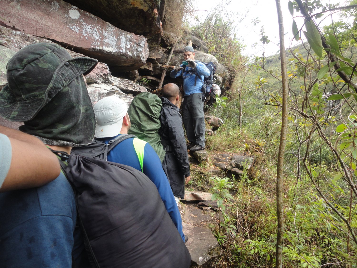Fila indiana para subir a escada que fica no meio da trilha que liga o poço do 21 ao seu topo! Em 2019, restava apenas um toco desta escada.