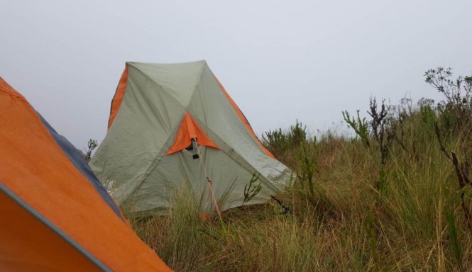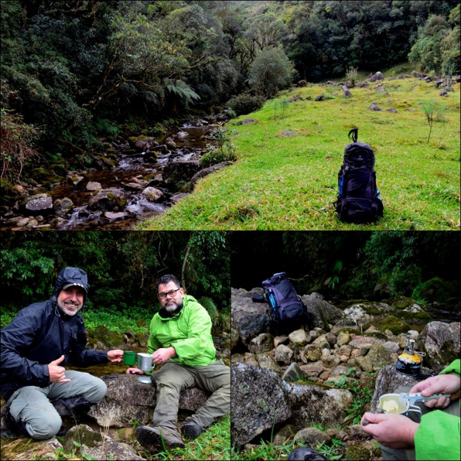 Sete da manhã, com os primeiros sinais de claridade e entre essa bruma molhada, tratamos de tomar coragem de sair das barracas, desmontar o acampamento e descer a trilha ao encontro do rio, para lá tomar um café da manhã e depois seguir de volta até o nosso ponto de partida.