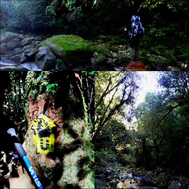 Assim que se passa pelo terceiro pastinho, a trilha volta a fechar e começa a ficar ingrime, indicando que estamos no pé da subida. Aqui as coisas ficam um pouco complicadas por conta de não haver mais a sinalização da trilha e com o início da presença das taquarinhas ou bambuzinhos (como preferir), a trilha perde suas características e deste momento em diante, para prosseguir, só conhecendo bem a região ou com o auxilio do GPS e do mapa de curvas de nível para poder seguir com segurança na direção que se deseja. O Sr. Gilson, durante nossa conversa, comentou que algumas vezes, já aconteceu de pessoas se perdendo na mata e tendo que chamar os bombeiros que contam sempre com a experiência do sr. Gilson para localizar os desafortunados que não encontram mais o caminho.
