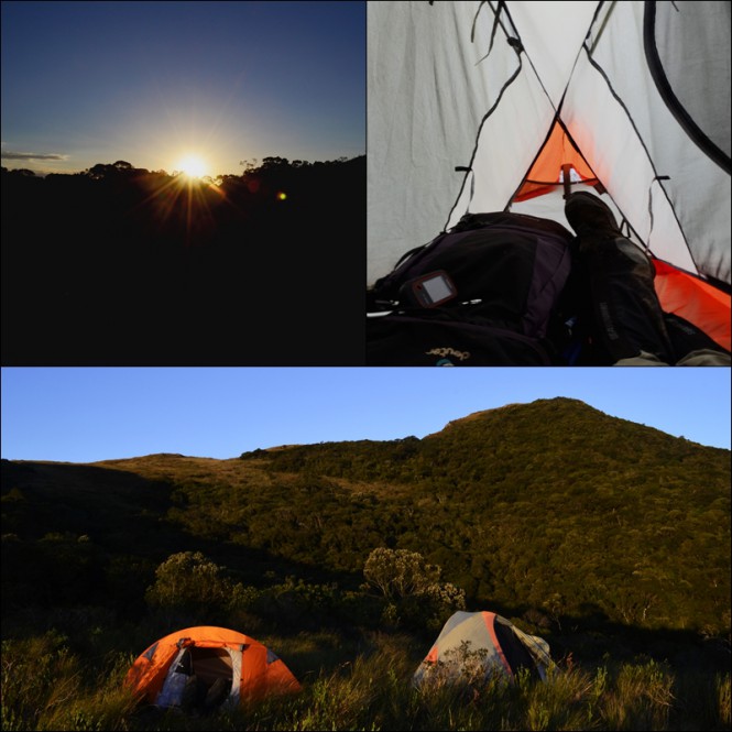 Depois de aproximandamente duas horas de rasga mato, morro acima, novamente encontramos a trilha que se abrindo e dando lugar a um campo de altitude e seus charcos. Como nossa intenção era apenas chegar o mais próximo do cume do Morro das Pedras, e já sendo praticamente fim de tarde, tratamos de localizar um local mais elevado e com o solo seco para montarmos acampamento curtir a vibe do pôr do sol e passar a noite.