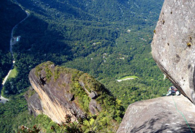 Ao final desta lage, uma passada difícil ao pular para outra pedra onde se inicia o rapel. Parada equalizada, corda para baixo e o primeiro rapel segue sem problemas desviando de alguns arbustos, algumas pedras e pronto, chega-se a outra base à beira do precipício. Tem início o mesmo procedimento, equalização, corda para baixo, prussik, freio, check. E agora o final do rapel é negativo dá um pouco de trabalho mas se chega em outra plataforma. O terceiro e último rapel é curto e a partir daí a escalaminhada para descer acontece pela crista oeste utilizando cabos de aço.