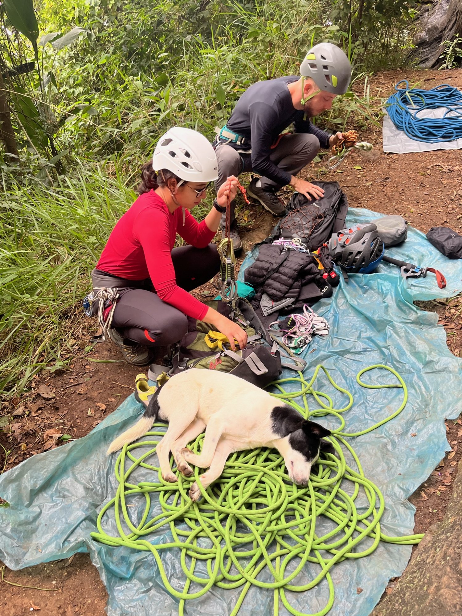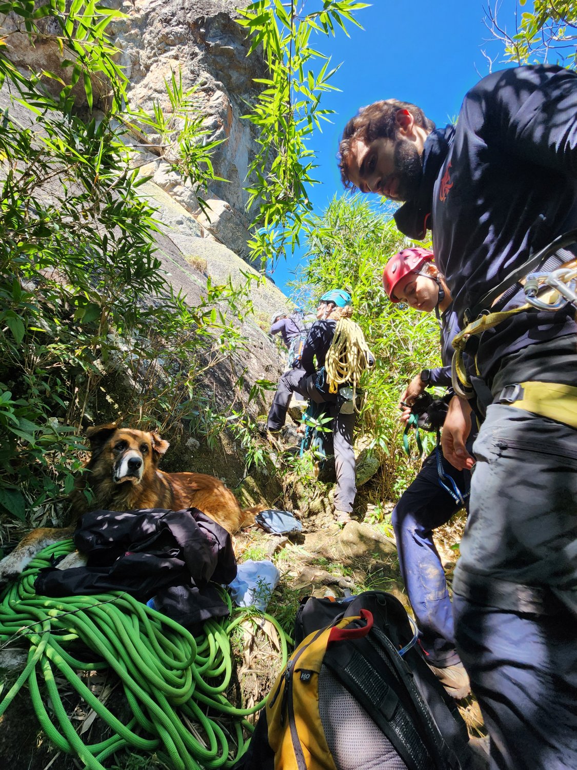 Tocamos então para o BPO, que fica a uns 40 minutos da casa e fica no caminho de volta. A aproximação foi bem tranquila, levando no máximo 10 minutos. E adivinha? Novamente apareceu um cachorro para nos acompanhar durante o dia, que apelidamos de Tobias. Tínhamos algumas informações sobre o local à mão, e começamos a procurar os setores mais fáceis. Para nossa desagradável surpresa, boa parte dos setores estava molhada, e sem melhores informações paramos numa via de 7a.