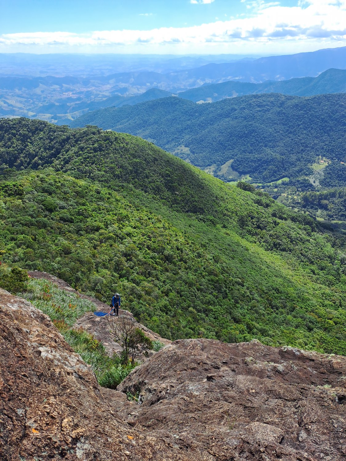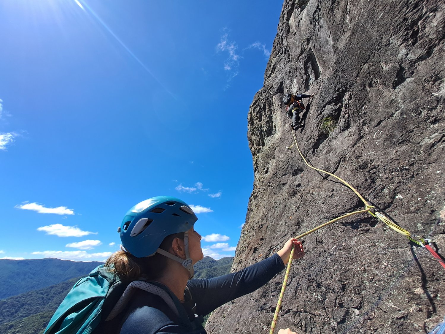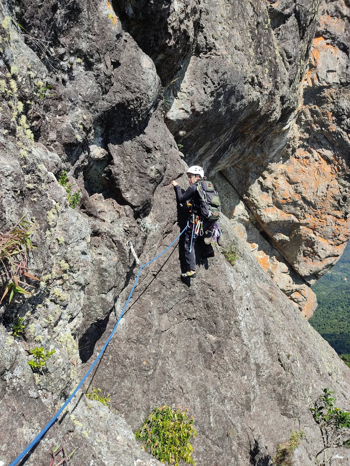 Foi necessário mais uns minutos para respirar e recuperar as energias antes de continuar por conta do cansaço acumulado da trilha e do primeiro esticão, especialmente no lance de 4° grau que é um pouco exigente para os braços. A essa altura a cordada do Bernardo já estava chegando na segunda parada, e a Luíza assumiu a guiada da próxima enfiada, que é curta e tranquila, com agarras grandes que começam a predominar na parede. Chegando na P2 tivemos mais tempo para apreciar a paisagem, já que na terceira enfiada fica o artificial que naturalmente é demorado para ser feito, especialmente para o Bernardo que iria montar todo o esquema.
