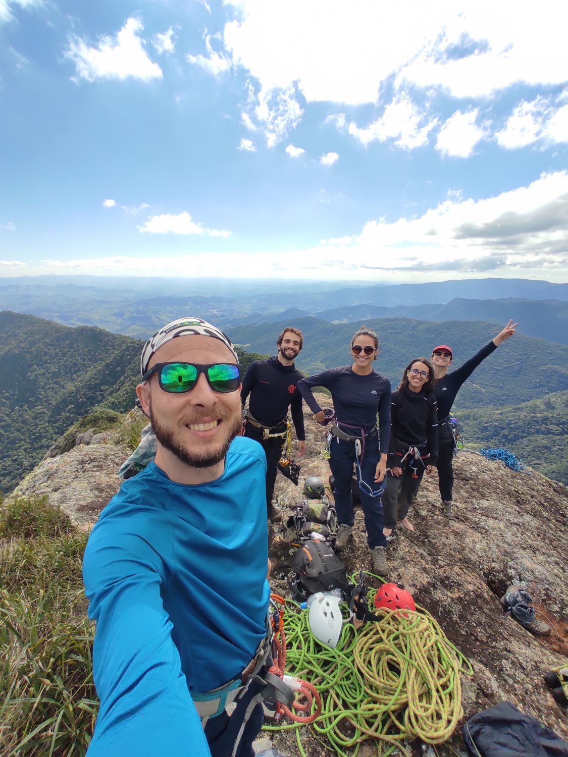 Daqui até o cume restava apenas uma enfiada cheia, que a Luíza tocou na agilidade de sempre, e às 14h eu enfim estava me juntando aos demais no topo do Picu. A área do cume, notavelmente espaçosa, abriga um livro de registro para os que concluem a ascensão. Atingir o topo de uma montanha inacessível por outros meios que não seja a escalada é uma sensação extremamente gratificante.