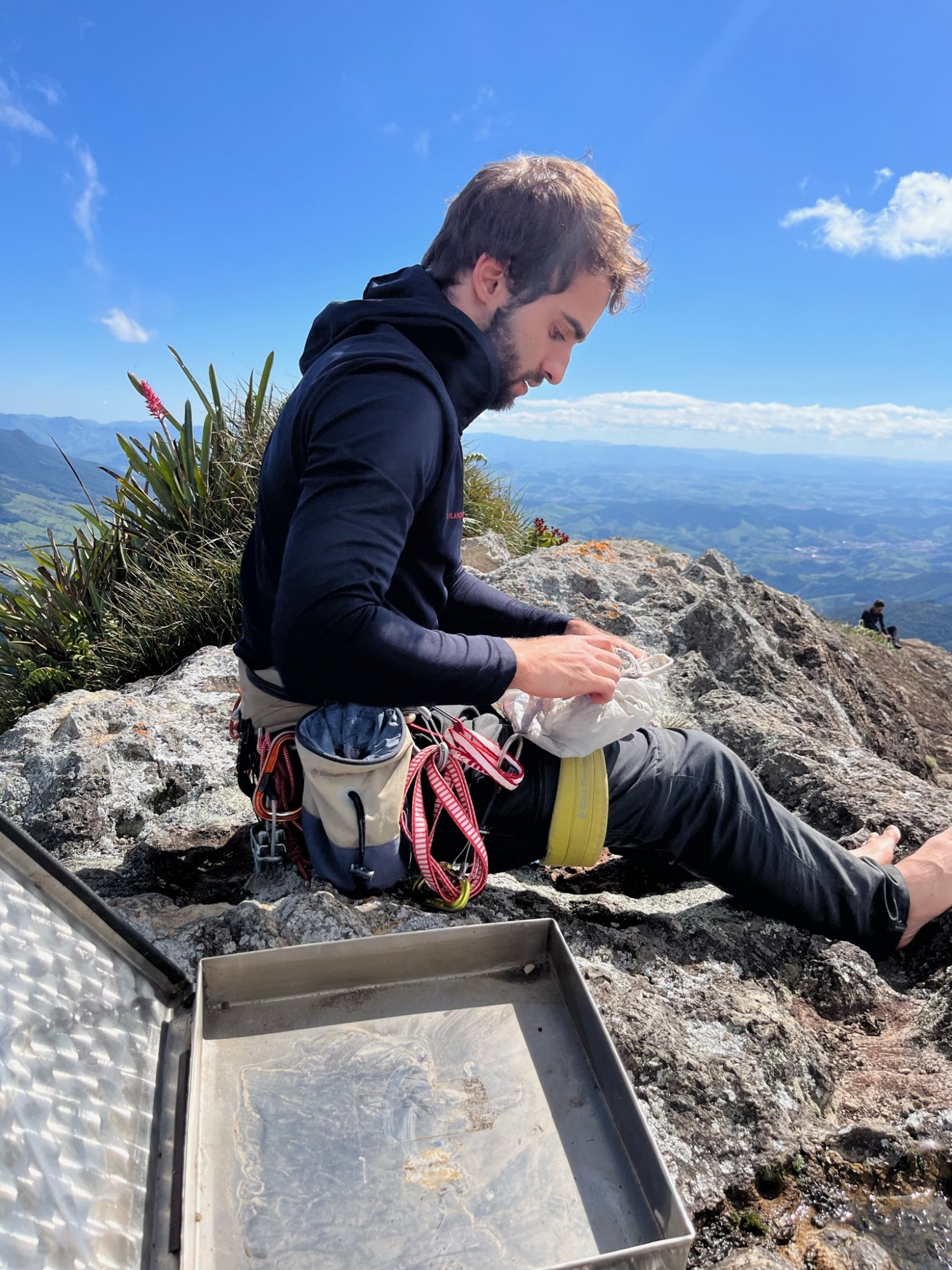Chegando ao topo, nos juntamos a três outros escaladores que haviam completado a escalada da via Frango a Passarinho, uma clássica e difícil via de 6° grau do Picu. Durante a descida, que normalmente é feita pela Naval, fizemos rapel junto com eles, compartilhando paradas e cordas e aproveitando para trocar ideias com os locais. Foi surpreendente quando um dos escaladores tirou uma tigela de poke da mochila como lanche de trilha. Esse rapaz do poke trabalha num restaurante nas redondezas, e garantiu que se a gente quisesse era só entrar em contato que ele agilizaria um delivery de poke pra gente. Pessoalmente, suspeitei que um poke, que consiste em peixe cru e outros ingredientes altamente perecíveis, estaria em perfeito estado depois de 3h de trilha e 2h de escalada. Mas confesso que estava muito bonito e deu vontade de experimentar (tanto que pedi um poke assim que cheguei no Rio).