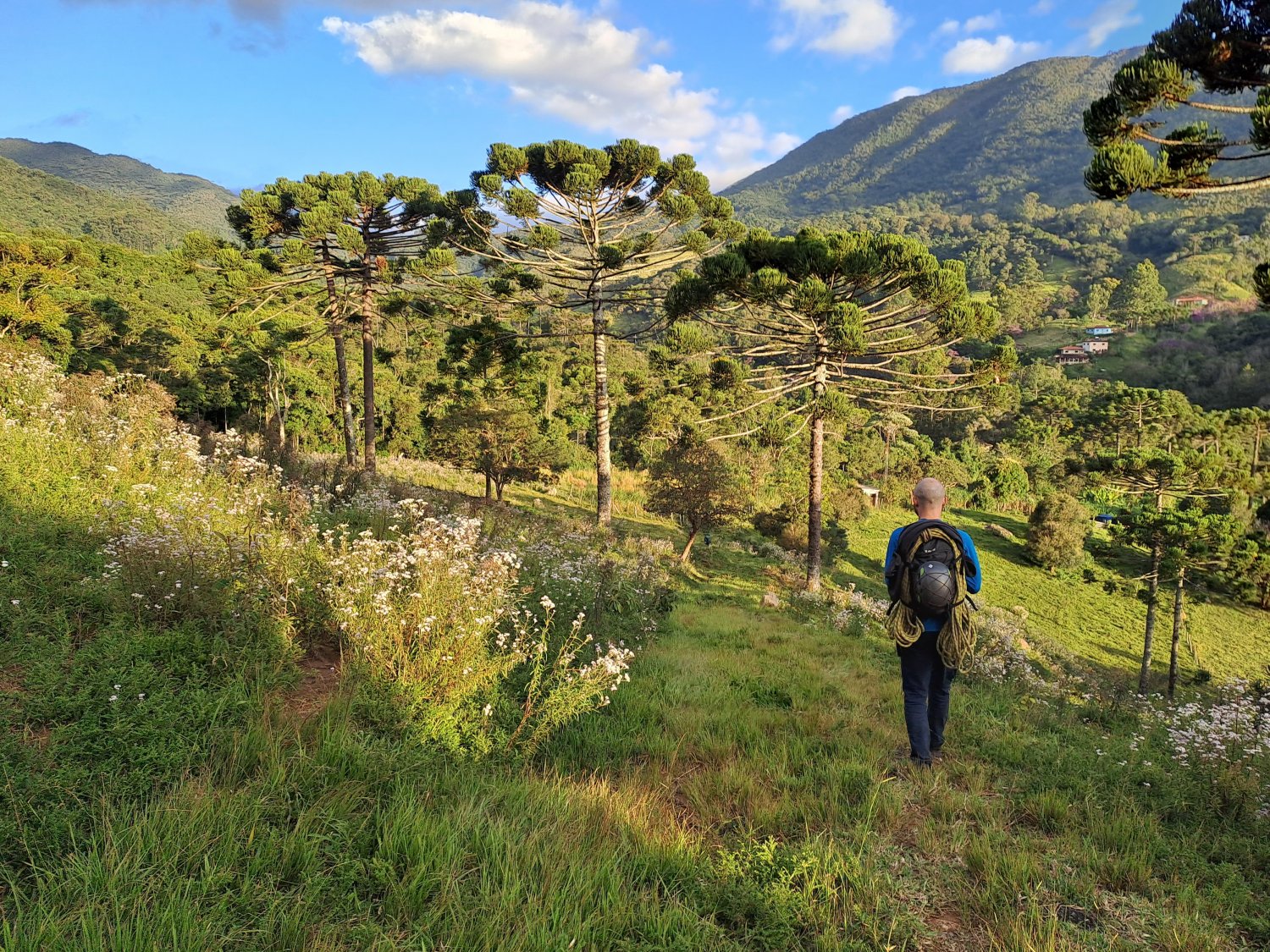 Bem perto do começo da trilha há uma envasadora de água mineral que fornece água boa para quem quiser pegar. Enchemos nossas garrafas e demos início à trilha, pontualmente às 8:08. A caminhada começa ainda na vila, próximo às casas. Assim que começamos a caminhar, pouco antes de entrarmos na mata, apareceu um companheiro canino que nos acompanhou durante todo o dia, que apelidamos carinhosamente de Simba por ser todo peludão e remeter vagamente a um leão. Nesse primeiro trecho, que levou cerca de meia hora, a trilha passa por uma pequena mata e chega num pasto todo florido subindo num ritmo tranquilo, que nos dá a falsa impressão de que a caminhada seria fácil assim até o final.