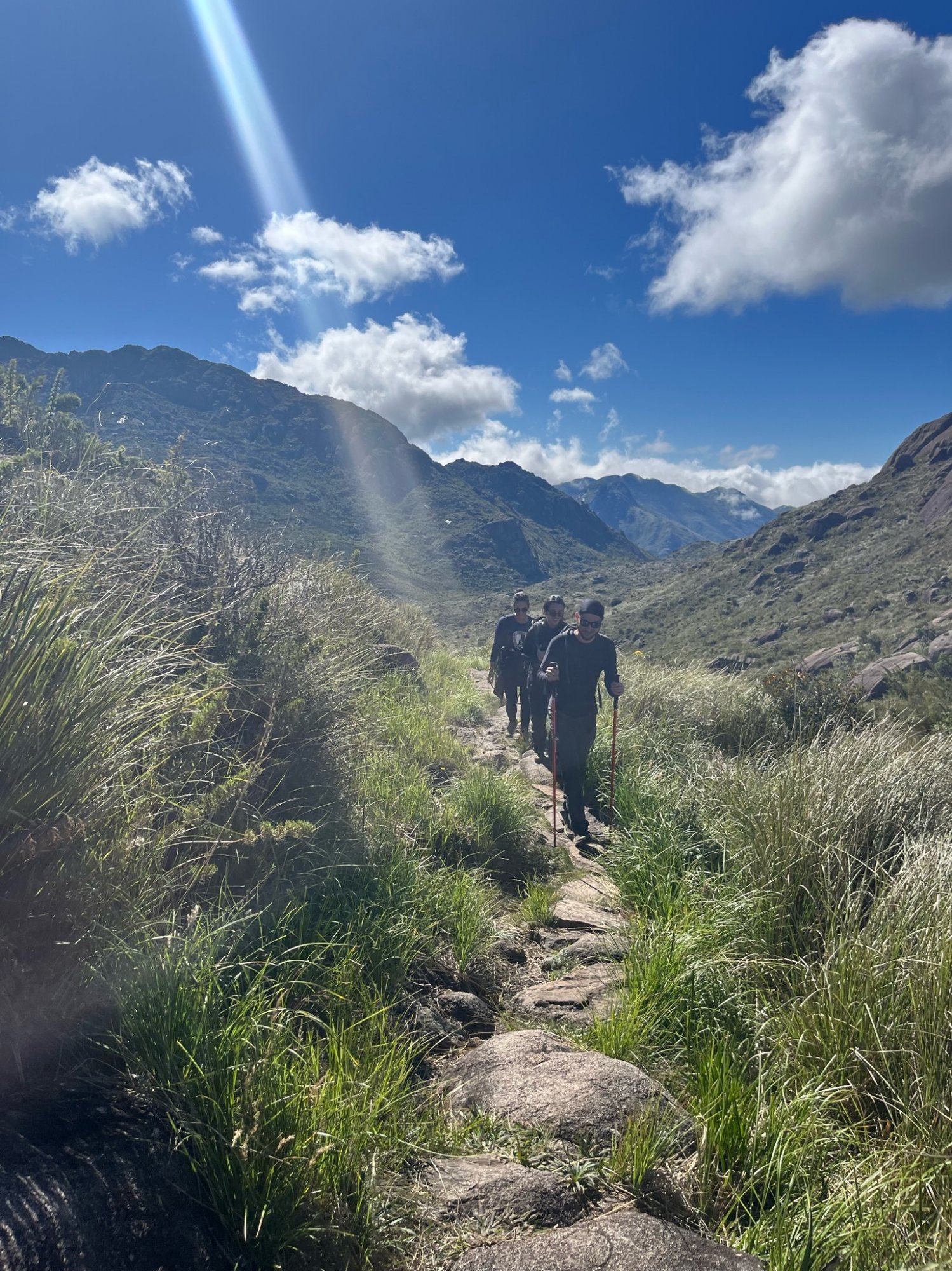 A trilha, apesar de simples e prazerosa, exigia um mínimo esforço que talvez alguns de nossos membros não estivessem tão dispostos assim. Luíza e Érica já apresentavam sinais de cansaço evidentes nos primeiros quilômetros, tendo crises de riso a cada degrau de pedra que tinha que subir. Como diria Frejat: “E que você descubra que rir é bom, mas rir de tudo é desespero”. E era desespero mesmo, mas melhor rir que chorar. Bora tocar pra cima.