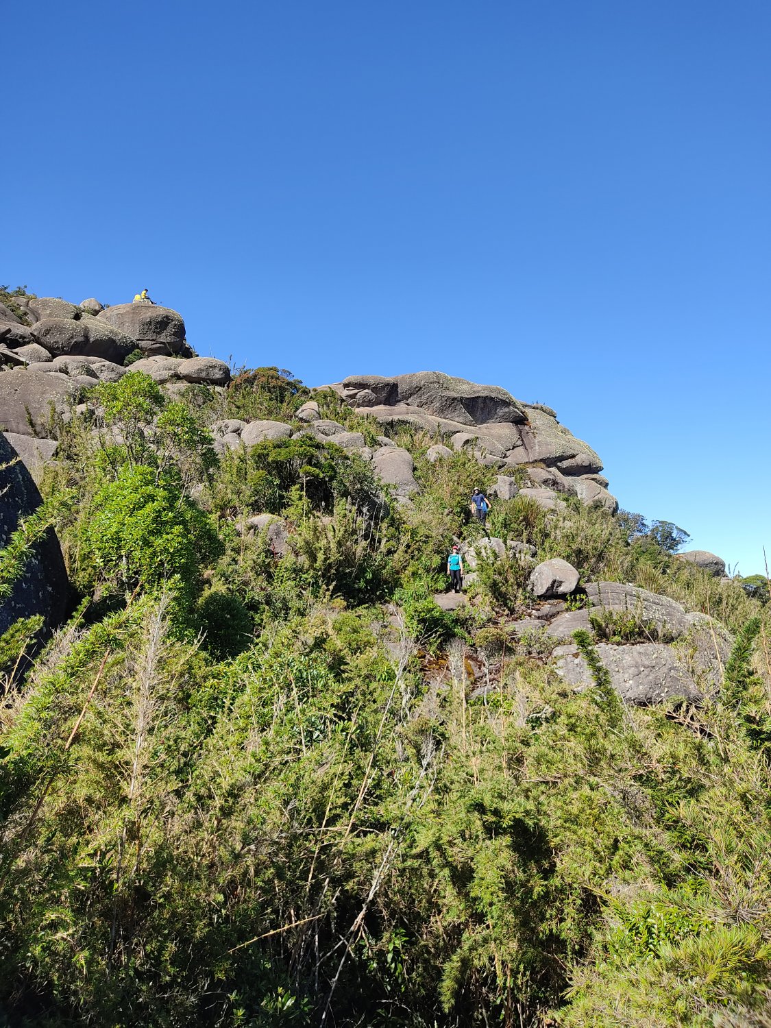 A trilha até as Prateleiras é bem simples, principalmente quando comparada à trilha do Picu. No caminho vemos diversos setores de escalada, como o Paredão Carolina e o Paredão Amizade, e já fomos pensando no que poderia ser feito caso voltássemos cedo das Prateleiras. Essa trilha tem as melhores características que uma trilha pode ter: praticamente plana, bem sinalizada, com visuais deslumbrantes ao longo de todo percurso. Pra nossa sorte, o dia estava super aberto com um céu azul de ofuscar a vista e com o Agulhas sempre imponente nos acompanhando em todo trajeto. Tava tudo perfeito até que uma leve irritação surgiu na minha cabeça e percebi o quão chato é o tec-tec da ponta do bastão nas pedras. Resolvi guardar o bastão e o cenário ficou inteiro perfeito. O som desse silêncio especificamente, é um dos meus sons preferidos. Ele traz uma paz de espírito inigualável e sempre me lembra a musica “the sound of silence” quando penso nisso.