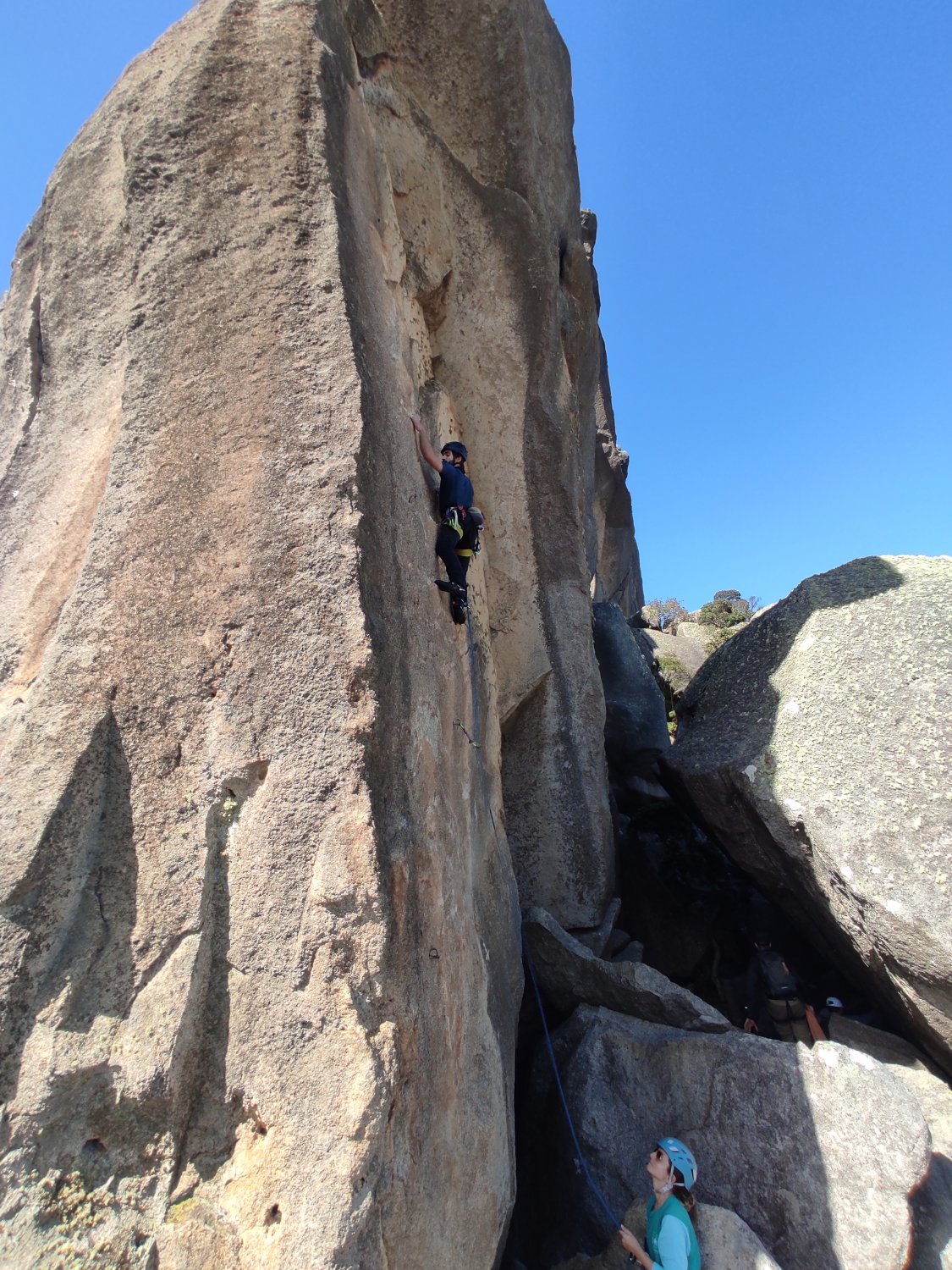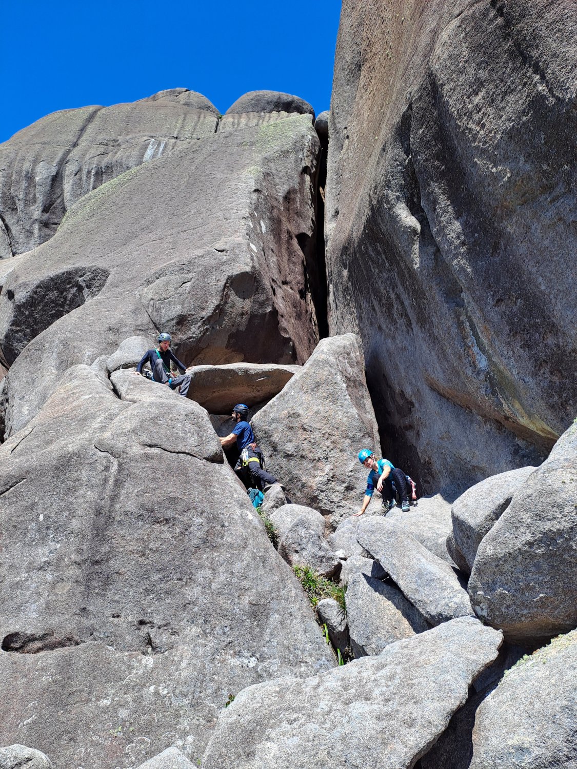 Depois de 3 horas questionando frequentemente nossas escolhas de vida, chegamos à base da via que iríamos escalar, a Via do Naval, graduada em 3° IV E2, com um trecho de Vsup passível de ser feito em A0. A via possui 160 metros de extensão e é a mais clássica e utilizada para acessar o cume do Picu. Havia uma dupla na nossa frente que estava se equipando assim que chegamos, o que foi conveniente para descansarmos um pouco mais e fazer um lanche merecido depois daquela trilha trabalhosa. Decidimos que a primeira cordada seria formada pelo Bernardo, Aline e Érica, e eu e a Luíza seguiríamos atrás na outra cordada, pra não perdermos o costume.