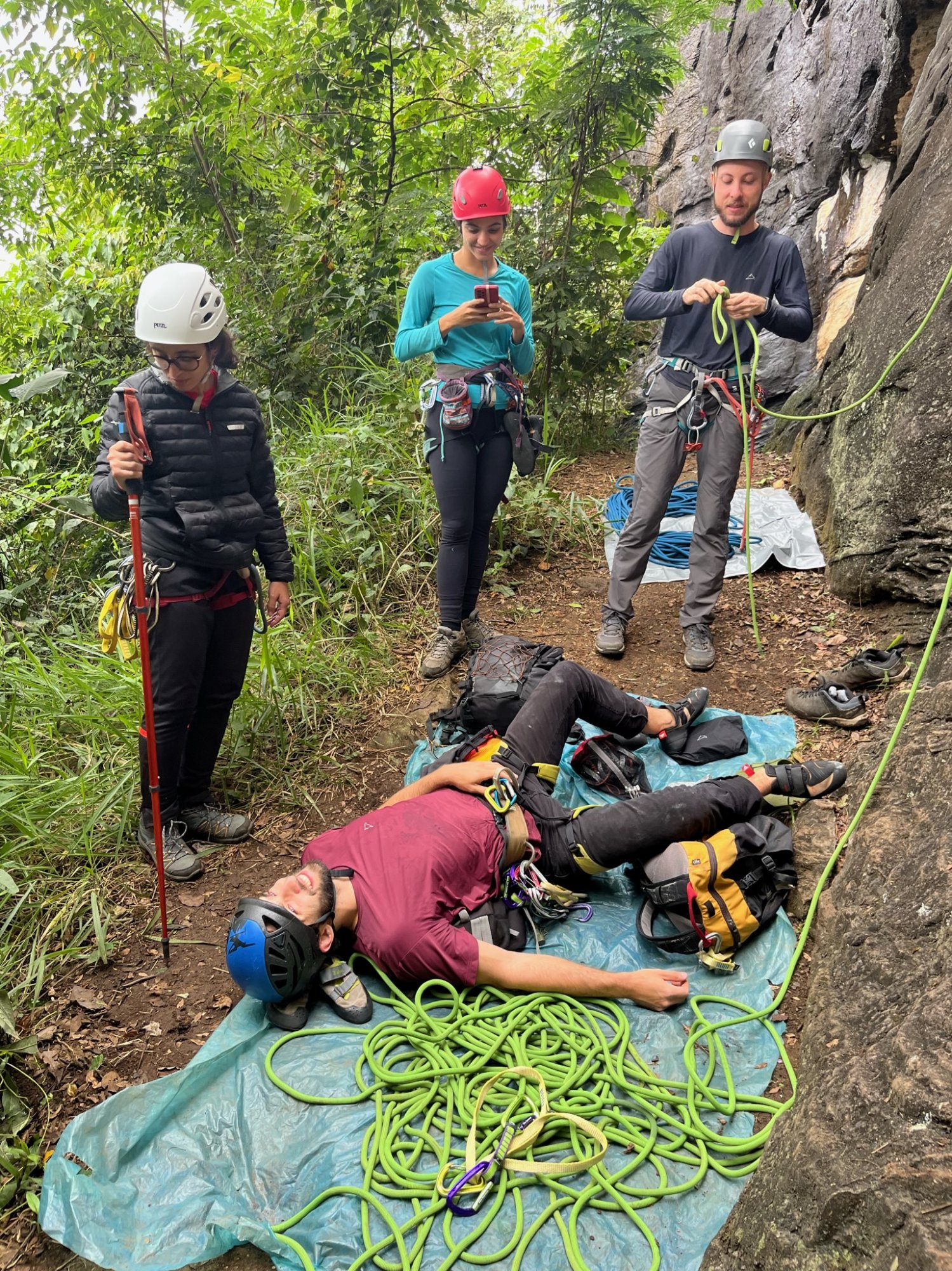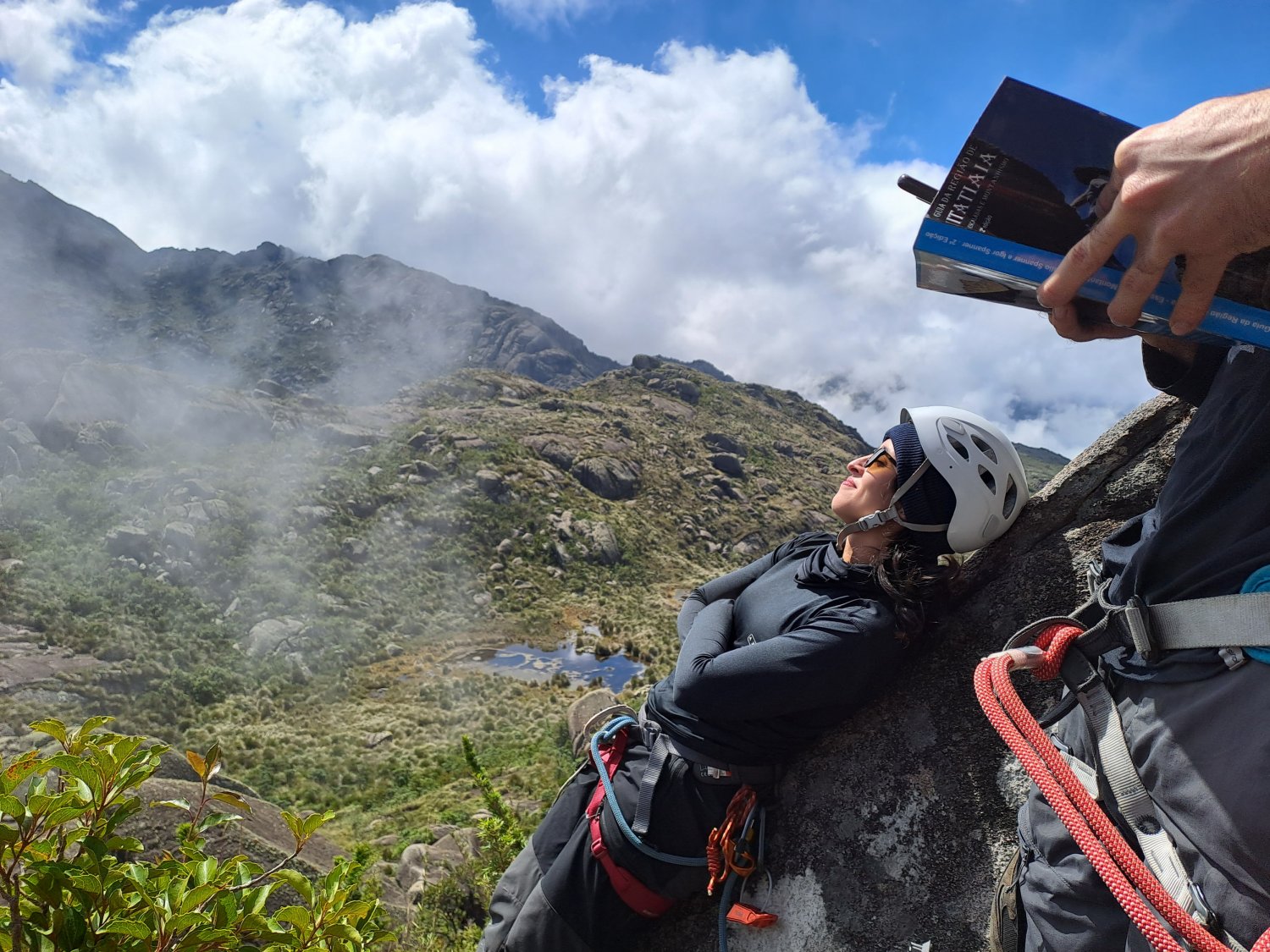 Depois da batalha que foi vencer essa macega, Luíza e Érica acharam melhor não escalar e resolveram ficar tranquilas na base. Com isso, Bernardo, Aline e eu fechamos uma cordada de três na via Amizade. Ela é graduada em 3° IV E2, e é melhor protegida do que a outra via da parede, a Surpresa. Bernardo guiou a única enfiada de 45 metros e eu fiz a sua segurança enquanto a Aline tirava um cochilo na cama de mato que ela improvisou. “Se eu dormir, puxa a corda que eu acordo.” Na minha vez, levei as mãos para o céu e agradeci por não ter precisado guiar, já que ela possui diversas passadas delicadas, ou ao menos foi o que eu achei considerando todo o cansaço acumulado. Apesar disso, é uma via bem prazerosa de fazer, numa aderência cheia de abaulados e por vezes completamente lisa sem nada para as mãos, do jeito que satanás gosta. Depois de mim a Aline, braba como sempre, subiu de boas.